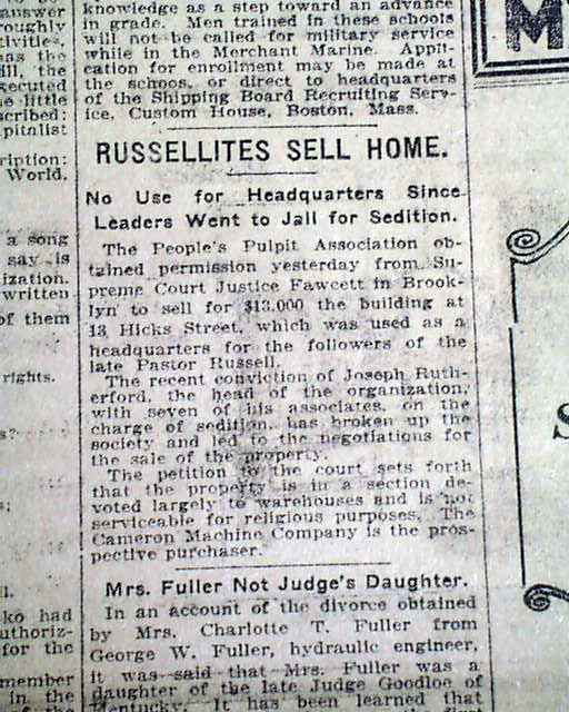 AI notes: On July 20, 1918, the Russellites—the Bible Student movement founded by Charles Taze Russell and formally known through the Watch Tower Bible and Tract Society—sold their Brooklyn, New York headquarters, including the Bethel facilities that had served as the movement’s administrative and residential center since 1909. The sale occurred during a period of intense crisis for the organization: the United States was at war, several Watch Tower leaders (including Society president J. F. Rutherford) were imprisoned under the Espionage Act for their antiwar publications, and the movement faced legal pressure, public hostility, and financial strain. Disposing of the Brooklyn property helped stabilize finances and marked a turning point in the group’s institutional history, as operations were scaled back and reorganized during the leadership vacuum—developments that ultimately preceded the post-1919 reconstitution of the movement that later became known as Jehovah’s Witnesses.