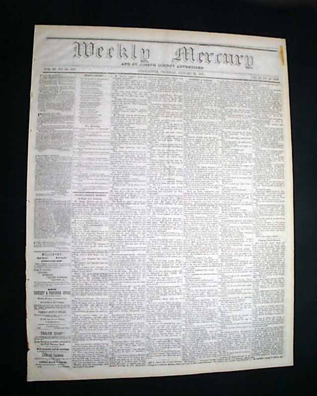 AI notes: The Weekly Mercury was a 19th-century local newspaper published in Constantine, Michigan, primarily serving St. Joseph County and its surrounding communities. It appeared under names such as the Weekly Mercury and St. Joseph County Advertiser, reflecting common naming practices of the era, and was active roughly between the 1850s and 1870s. Like many small-town papers of its time, it provided a mix of local news, advertisements, announcements, and political commentary tailored to its readership. The paper was part of a dynamic local press scene in Constantine, where titles frequently changed names or merged, and it played a key role in documenting the social, economic, and political life of the county during a period of significant growth and development. Copies of the Weekly Mercury are now primarily preserved on microfilm or in historical newspaper collections at local libraries and archives, such as the Constantine Township Library and the Library of Michigan.