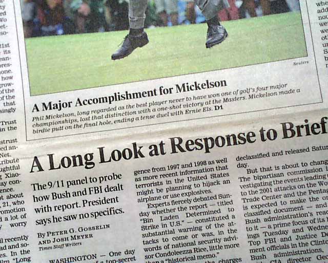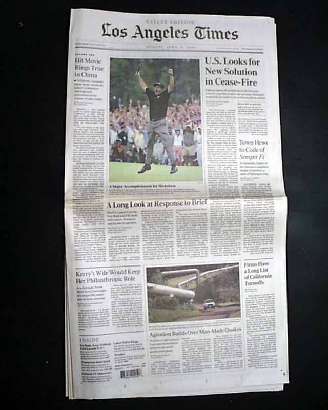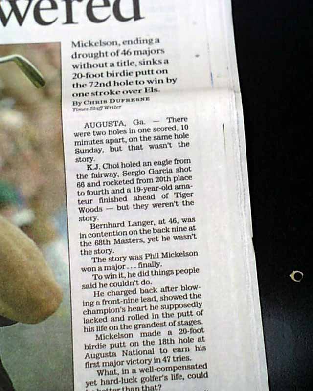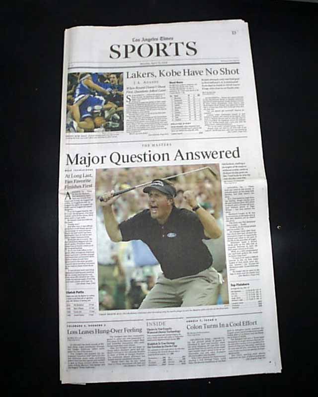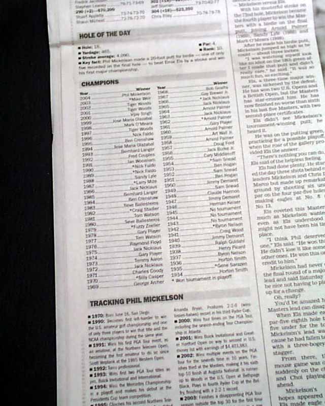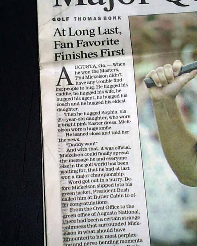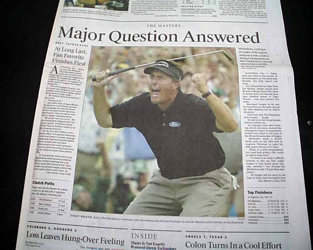 The front page has a three column color photo showing Mickelson's iconic celebrated jump on the final hole.