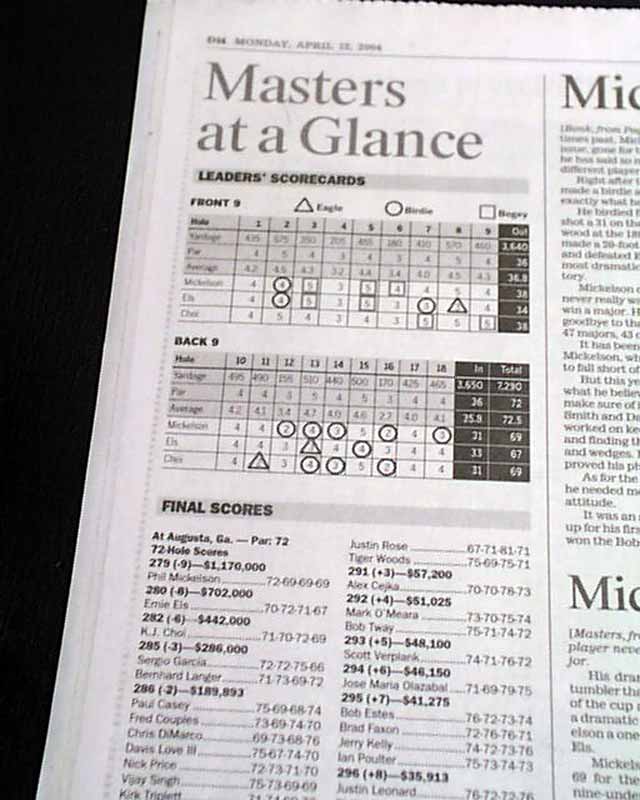 AI notes: In 2004, Phil Mickelson captured his first Masters Tournament victory at Augusta National, a milestone that ended years of near-misses in major championships and reshaped his career legacy. Entering the final round just one stroke behind the leaders, Mickelson played aggressively, particularly on the back nine, using his exceptional short game and putting skills to navigate Augusta’s challenging greens. He famously made clutch birdies on holes such as the par-5 13th and 15th, and steadied himself under pressure despite bogeys on 12 and 16, ultimately finishing nine under par with a one-stroke margin over Ernie Els. The win was celebrated not only as a personal breakthrough—finally shedding the label of the “best player never to win a major”—but also as a display of Mickelson’s fearless, inventive style of play, earning him widespread admiration from fans and peers alike.