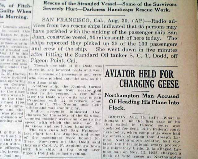The top of the front page has a three column heading: "65 PERSONS BELIEVED  LOST WHEN PASSENGER SHIP SINKS" with subhead. (see images)