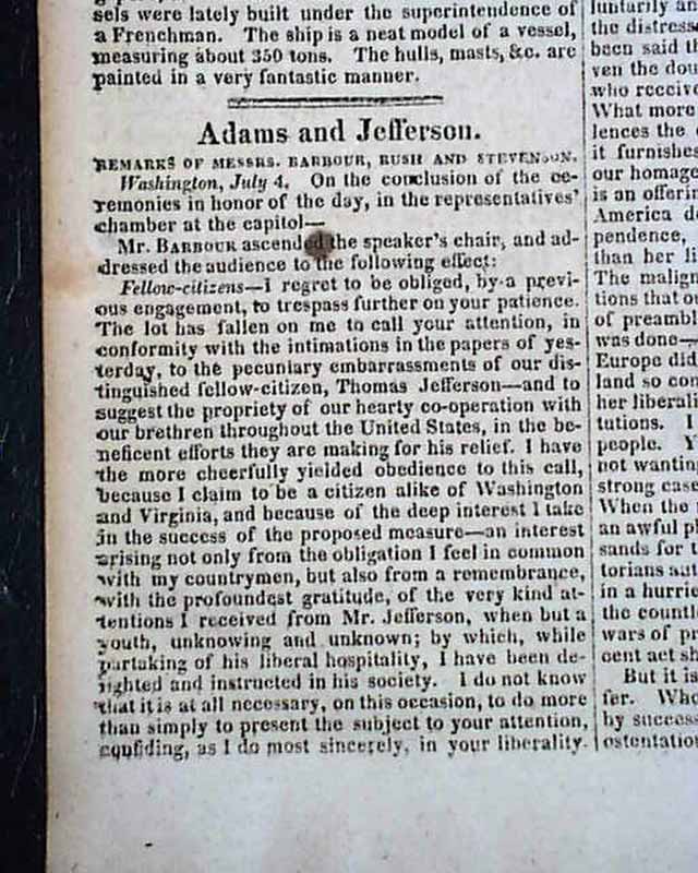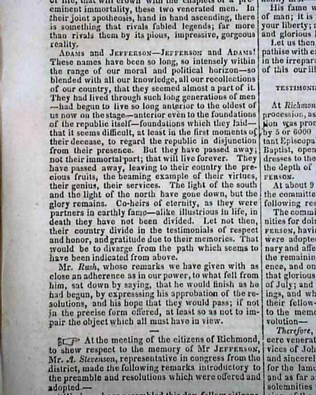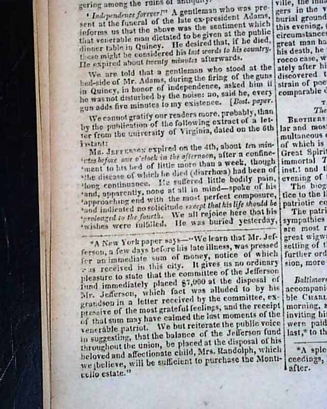 Other more timely articles in this issue notes the death of both Jefferson & Adams, including: "Testimonies of Respect for the Deceased Patriarchs" and "Adams and Jefferson--Jefferson and Adams!" as well as the letter from Jefferson's grandson dated: "Monticello, July 4, 1826" beginning: "I have withheld my letter to announce, not as I had vainly hoped, my beloved grandfather's restoration, but, alas! his death. He expired this day..." with more.