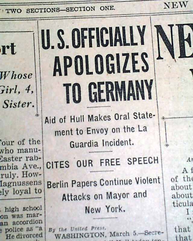 The top of the front page has a one column heading: "U.S. OFFICIALLY APOLOGIZES TO GERMANY" with subheads. (see images) Interesting report here when the United States apologized to probably the most ruthless dictators of all time.