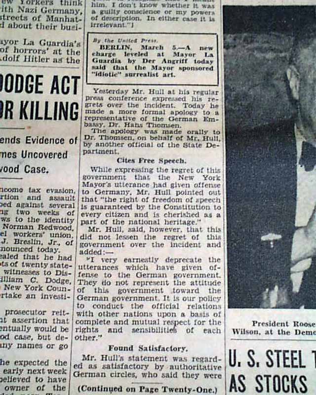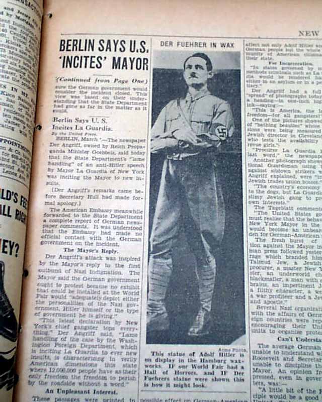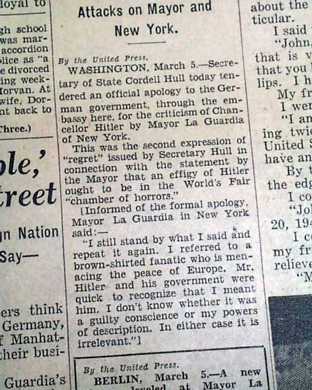 * Mayor Fiorello La Guardia insults Hitler calling him a "brown-shirted fanatic"