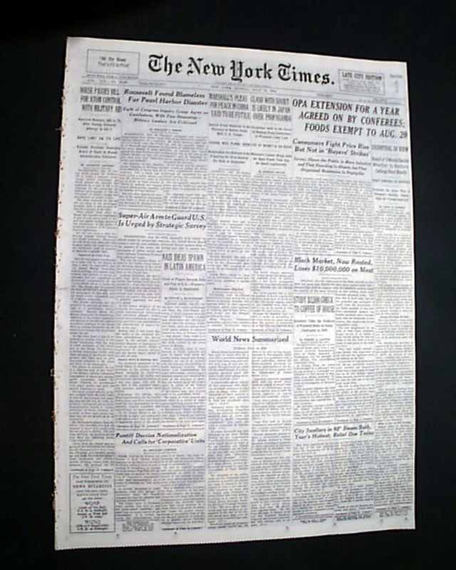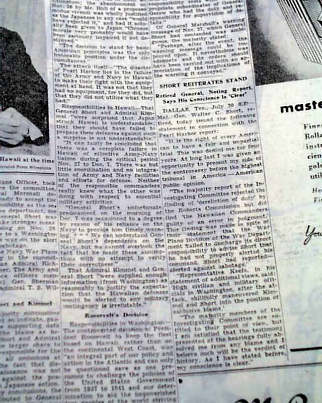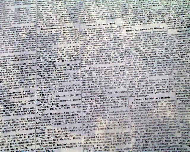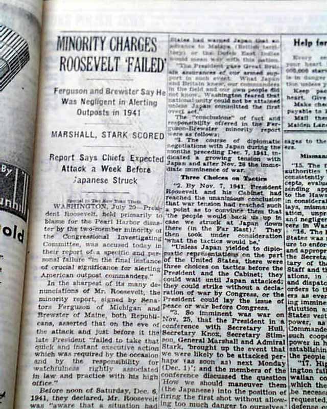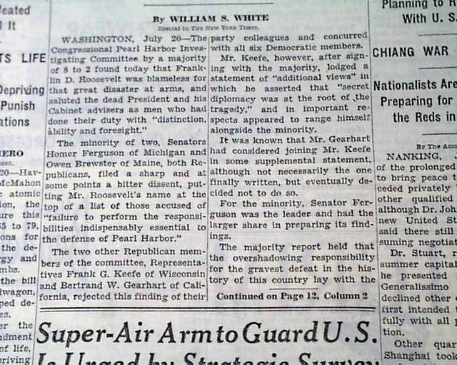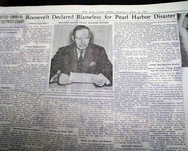 The top of the front page has a two column heading: "Roosevelt Found Blameless For Pearl Harbor Disaster" with subhead. (see images) Lengthy report continues inside with related photo.