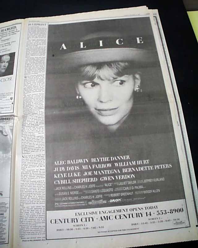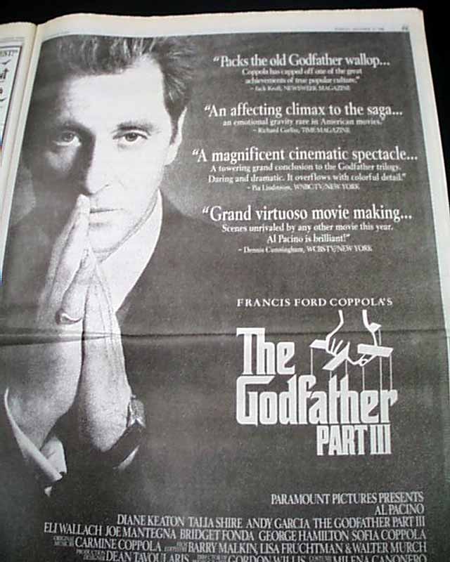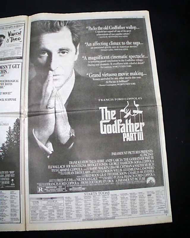 The front page of section F has a review of the film headed: "Paramount's Epic 'Godfather III' Struggle". And perhaps more significant is the terrific, full page poster-like advertisement for the film printed on it's opening day. (see).