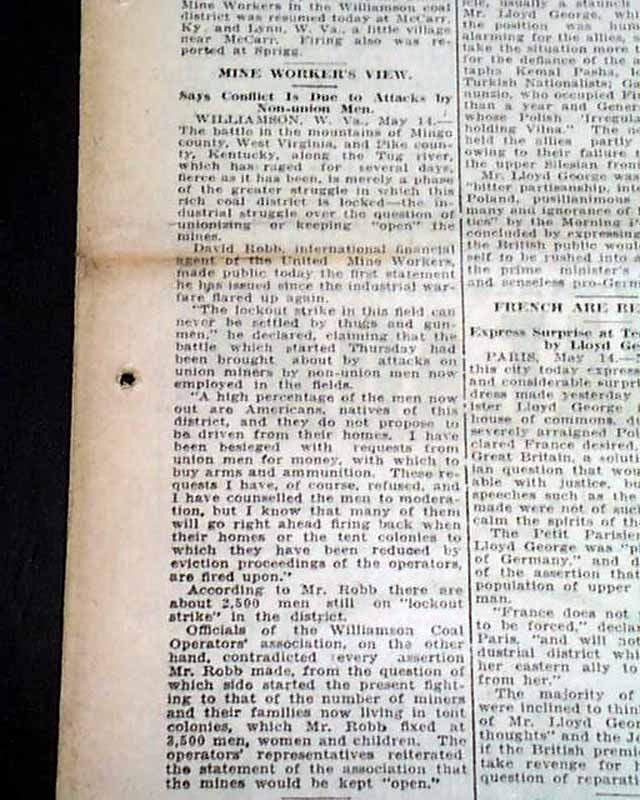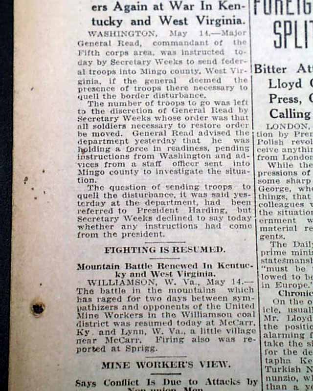 AI notes: On May 12, 1921, violence in the Mingo County coalfields of southern West Virginia escalated into what became known as the Mingo County coalfield war, a key episode in the broader West Virginia Mine Wars. Tensions had been building for months as unionized miners affiliated with the United Mine Workers of America clashed with coal operators determined to maintain nonunion control through company towns, private detectives, and friendly local law enforcement. The immediate outbreak followed continued evictions of union miners and their families, armed confrontations between miners and Baldwin–Felts detectives, and the imposition of martial law by state authorities. Shootings and ambushes around the towns of Matewan, Williamson, and along the Tug Fork marked the opening phase of open warfare, drawing national attention and prompting the governor to deploy state police and militia units. The unrest that began in mid-May set the stage for the much larger armed march of miners later that summer, culminating in the Battle of Blair Mountain, the largest labor uprising in U.S. history.