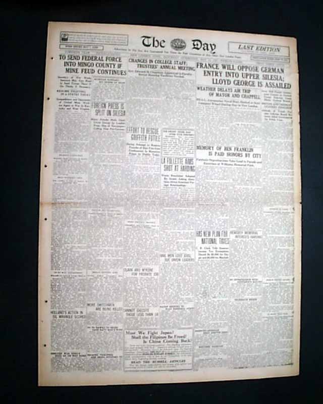 The top of the front page has a two column heading: "TO SEND FEDERAL FORCE INTO MINGO COUNTY IF MINE FEUD CONTINUES" with subheads. (see images)
