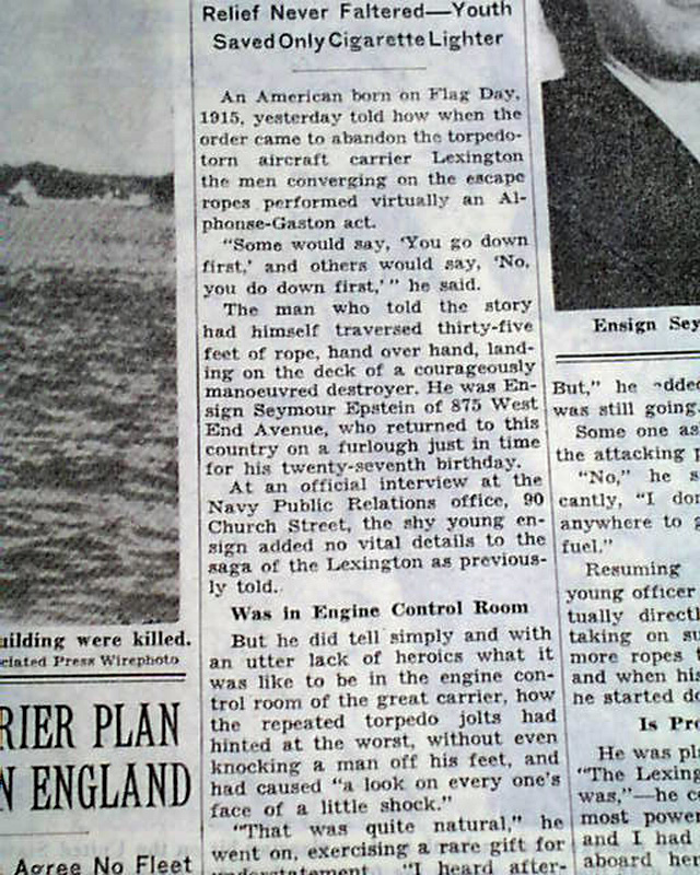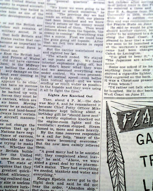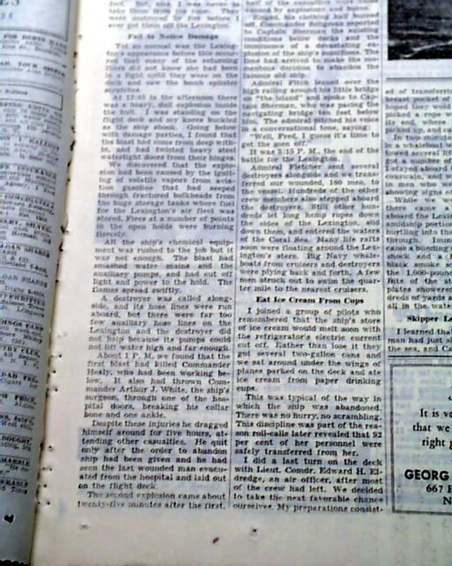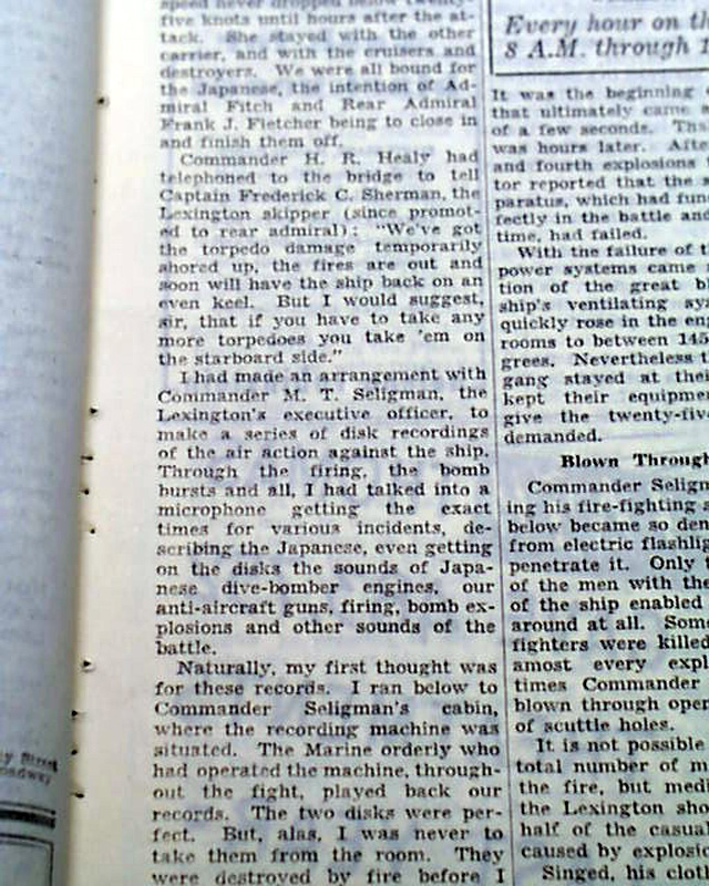The top of page 3 has a one column heading: "FLAMES ON CARRIER FOUGHT TO THE END" with subheads. Also four photos with heading: "As Coral Sea Battle Raged; First Blow To Lexington And Sinking Of Japanese Carrier" (see images)