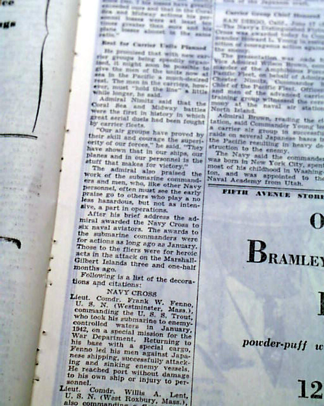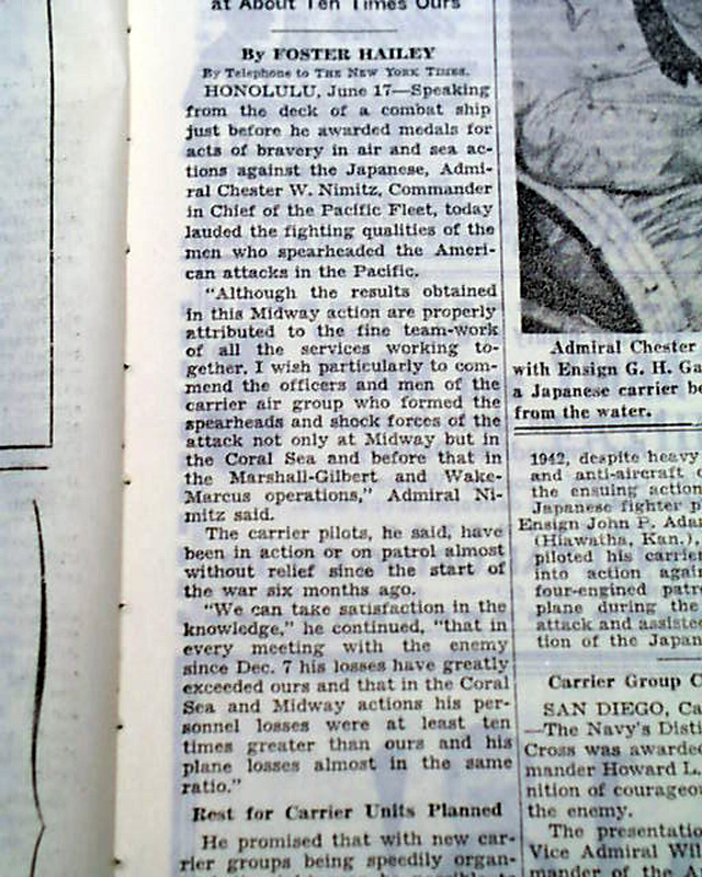 And the top of page 7 has a one column heading: "NIMITZ COMMENDS MEN OF CARRIERS" with subheads and photo showing Admiral Chester W. Nimitz with Ensign G.H. Gay.