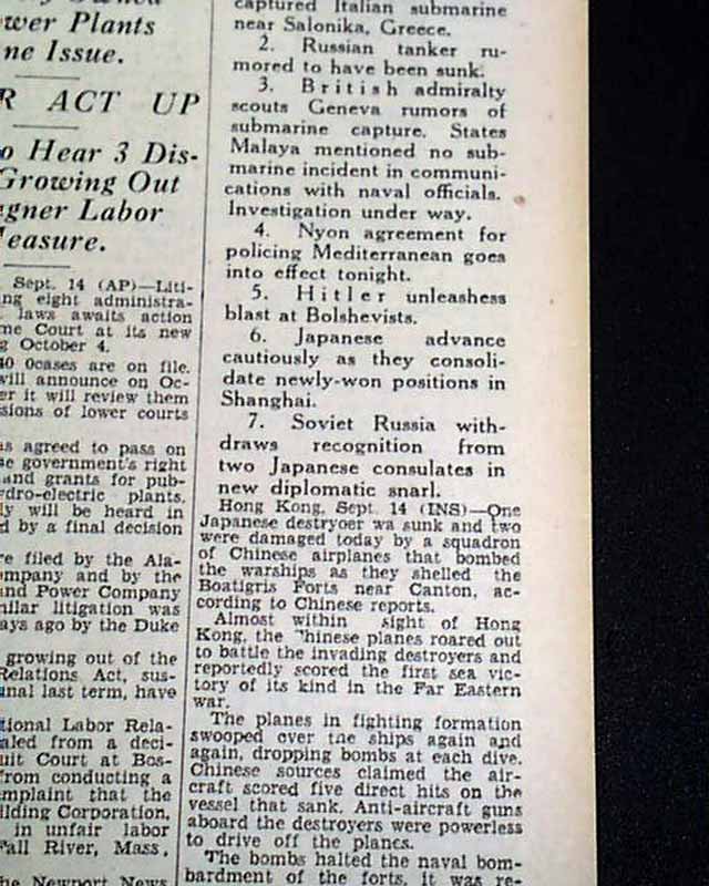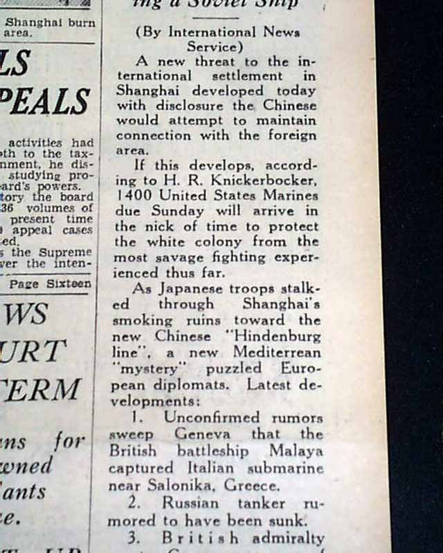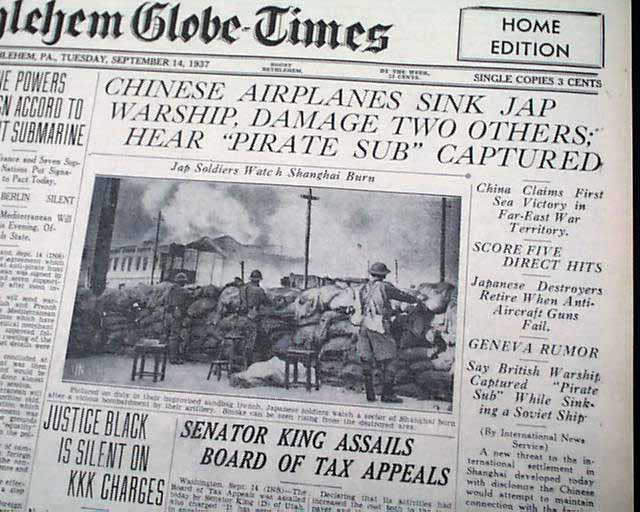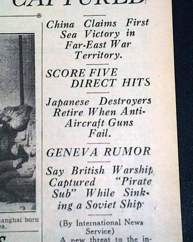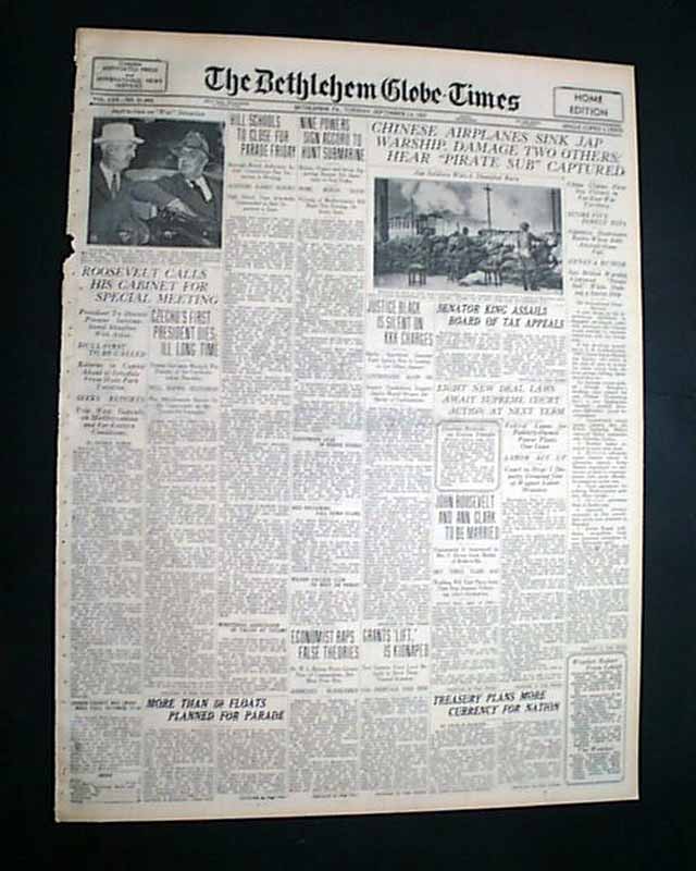 The top of the front page has a four column headline: "CHINESE AIRPLANES SINK JAP WARSHIP, DAMAGE TWO OTHERS; HEAR 'PIRATE SUB' CAPTURED" with subheads and related photo. (see images)