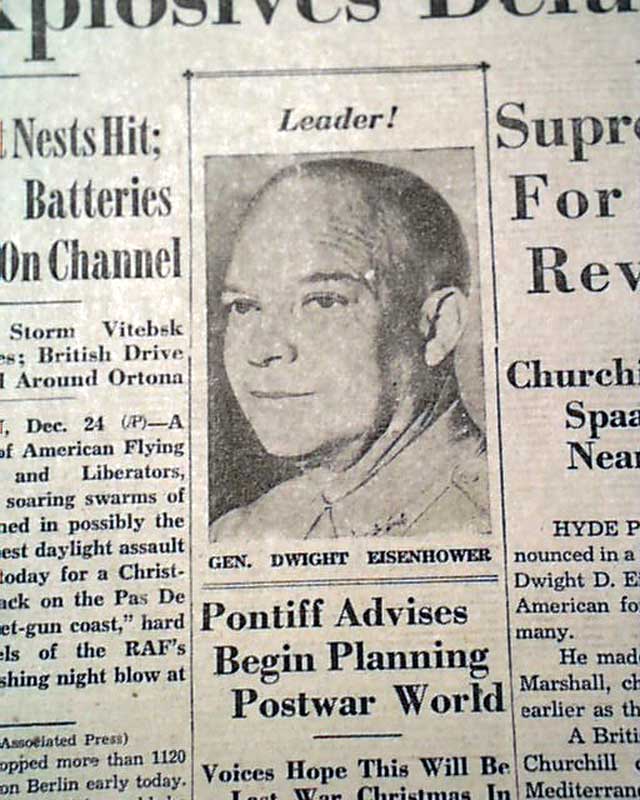AI notes: On December 24, 1943, General Dwight D. Eisenhower was officially named the Supreme Allied Commander for the planned invasion of Nazi-occupied Western Europe, later known as D-Day. At this point in World War II, the Allies were preparing Operation Overlord, a massive amphibious assault on the coast of Normandy, France, which required unprecedented coordination among American, British, Canadian, and other Allied forces. Eisenhower’s appointment placed him in charge of the overall strategy, logistics, and command of the multinational force, a role that demanded not only military skill but also exceptional diplomatic ability to manage competing national interests. His selection reflected the confidence of both President Franklin D. Roosevelt and Prime Minister Winston Churchill in his organizational talent and leadership, and it set the stage for the successful execution of June 6, 1944, when the Allies landed on Normandy’s beaches, marking a decisive turning point in the European theater of the war.