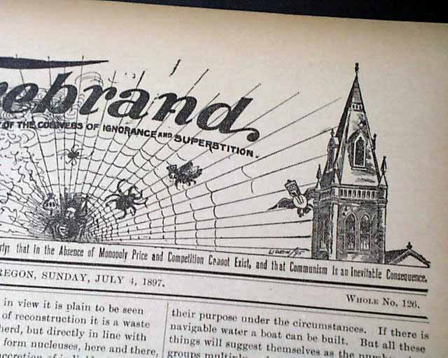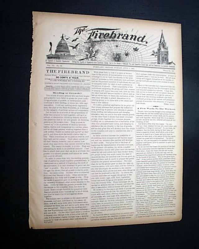 THE FIREBRAND, Portland, Oregon, July 4, 1897 A fascinating newspaper with their motto just under the title: "For the Burning Away of the Cobwebs of Ignorance and Superstition." and the dateline notes: "An Exponent of Anarchist - Communism. Holding that Equality of Opportunity alone Constitutes Liberty; that in the Absence of Monopoly Price and Competition Cannot Exist, and that Communism is an Inevitable Consequence."