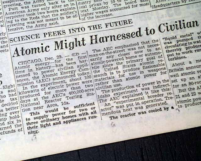 The bottom of the front page has a three column heading: "Atomic Might Harnessed to Civilian Uses" with lead-in: "Science Peeks Into The Future" (see images)