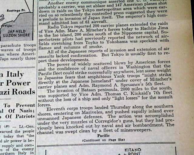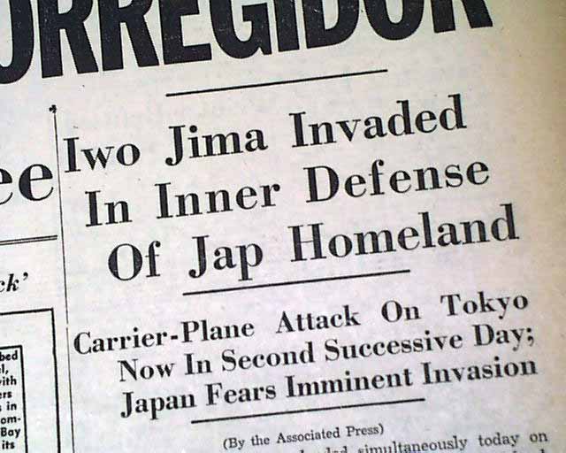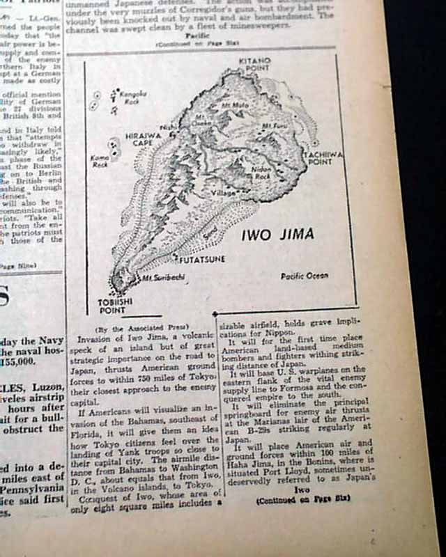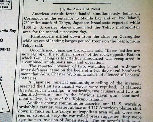 Also on the front page is a two column heading: "Iwo Jima Invaded In Inner Defense Of Jap Homeland" with related map. (see images)