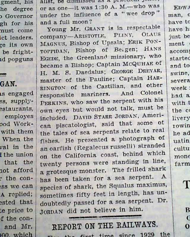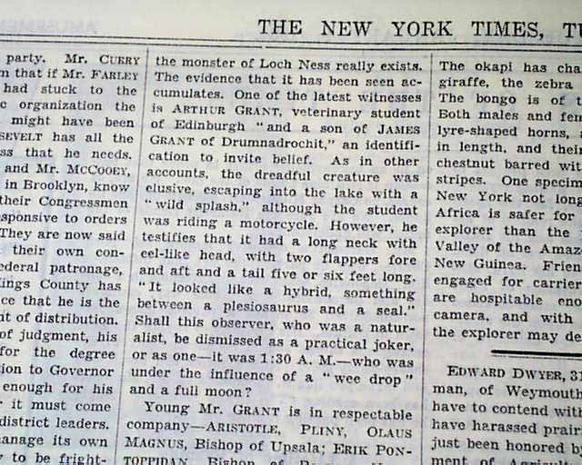 Certainly one of the more notable monster or creature searches in recent times is the Loch Ness Monster. Debate continues as to its existence. Page 20 has an editorial with a one column heading: "Sea Serpent" (see images)
