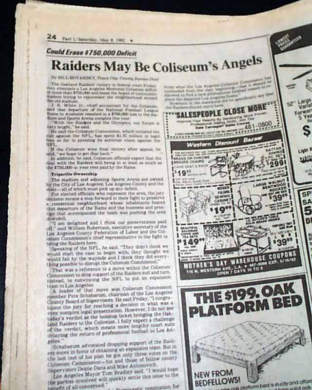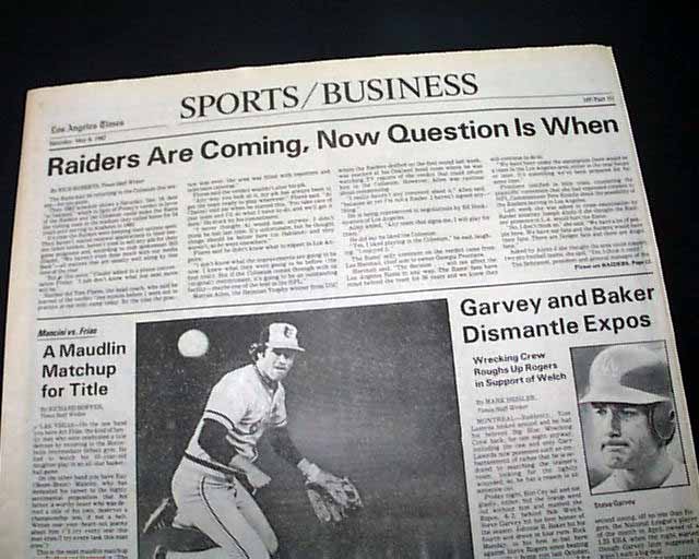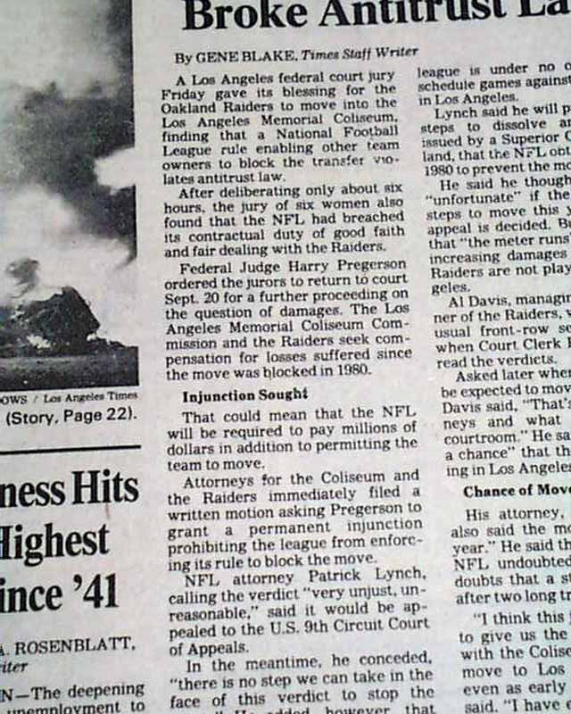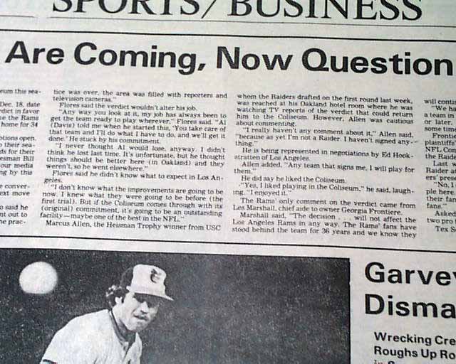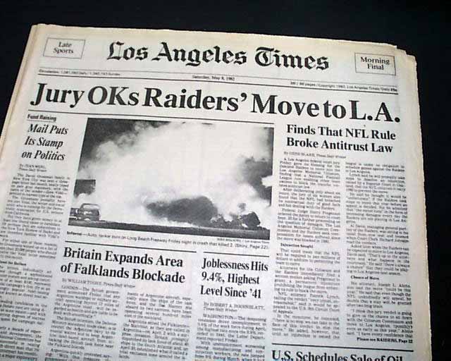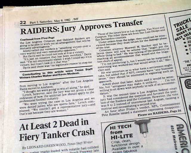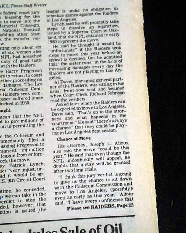 The top of of the front page has a nice banner headline: "Jury OKs Raiders' Move to L.A." with subhead. And the front page of the sport's section has a banner heading: "Raiders Are Coming, Now Question Is When" (see images. Great to have this in a L.A. publication.