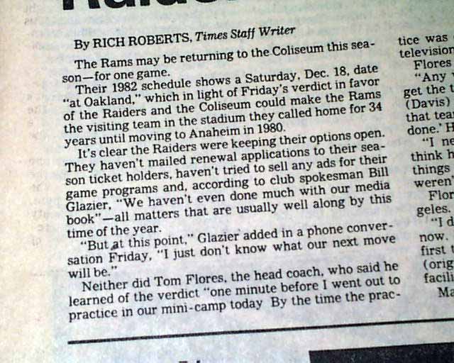 background: On May 7, 1982, the Oakland Raiders announced their relocation to Los Angeles, formally ending a contentious standoff between team owner Al Davis, the City of Oakland, and the NFL that had been brewing for years over stadium conditions and revenue issues. The Raiders planned to play their home games at the Los Angeles Memorial Coliseum beginning with the 1982 season, a move the NFL initially opposed but was ultimately forced to accept after a series of lawsuits. Oakland sued both the Raiders and the league, while Davis countersued, and the resulting court decisions significantly weakened the NFL’s ability to block franchise relocations. The move proved successful on the field, as the Raiders became one of the league’s most popular teams in Southern California and later won Super Bowl XVIII during their Los Angeles tenure, before eventually returning to Oakland in 1995.