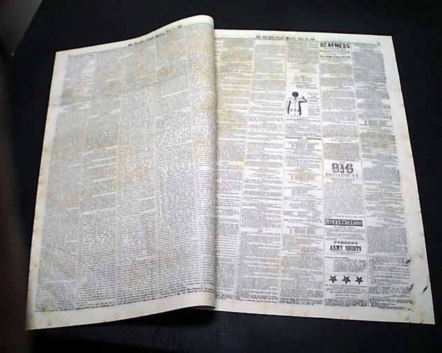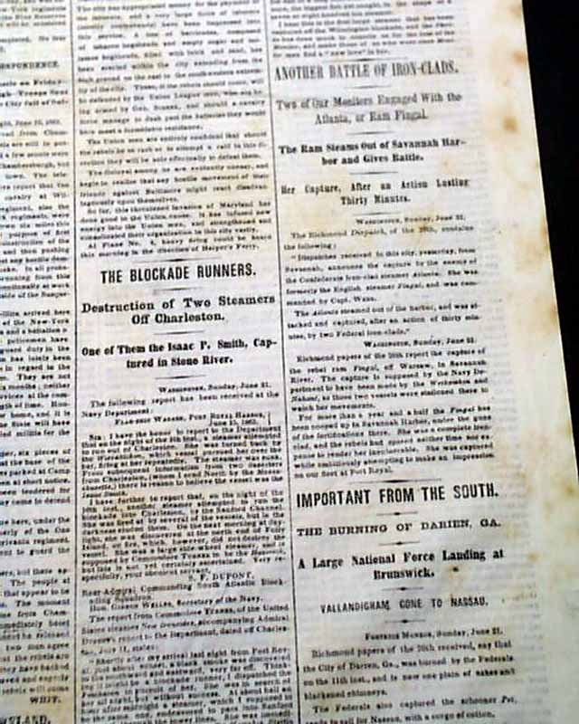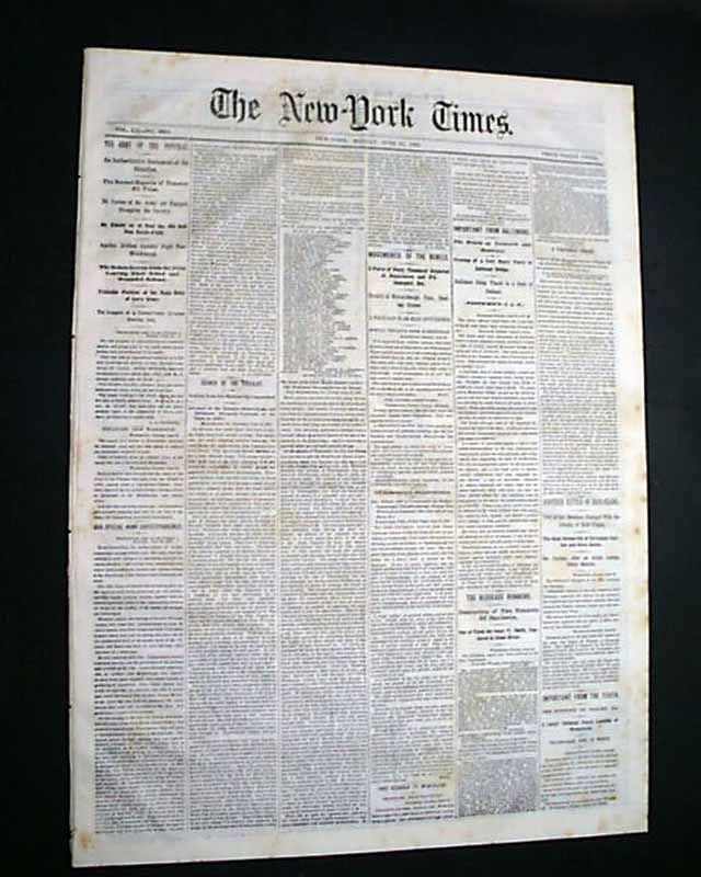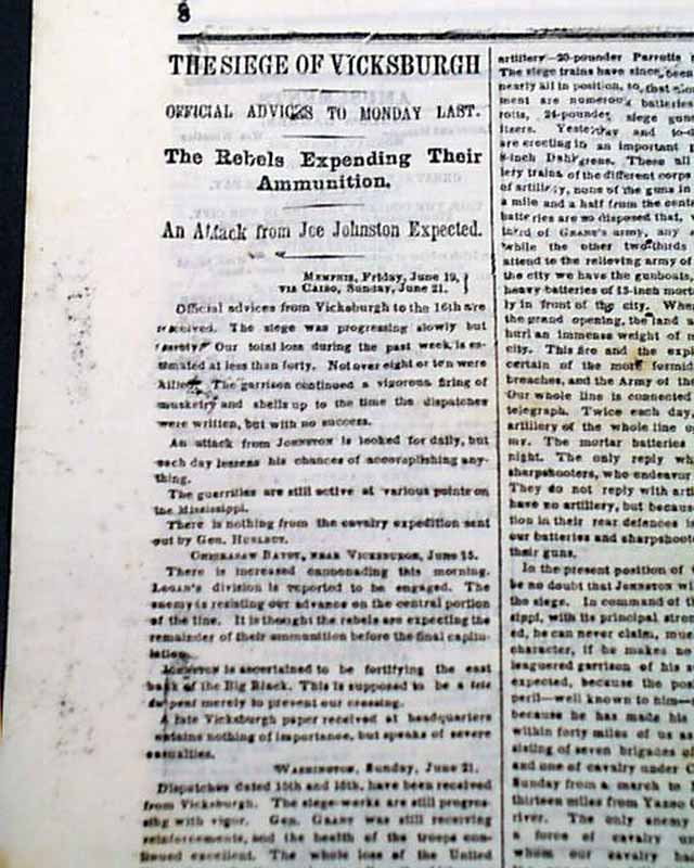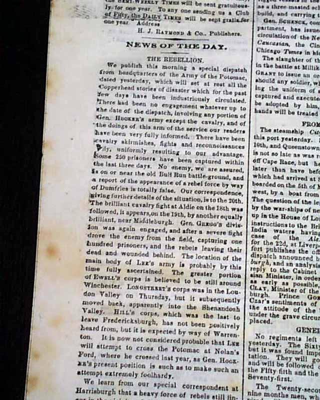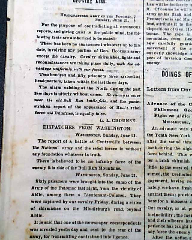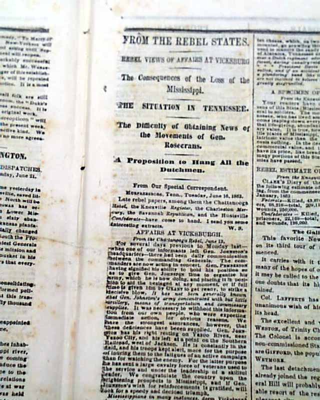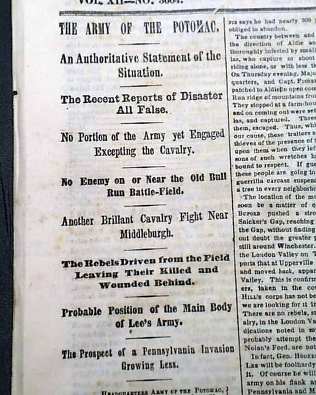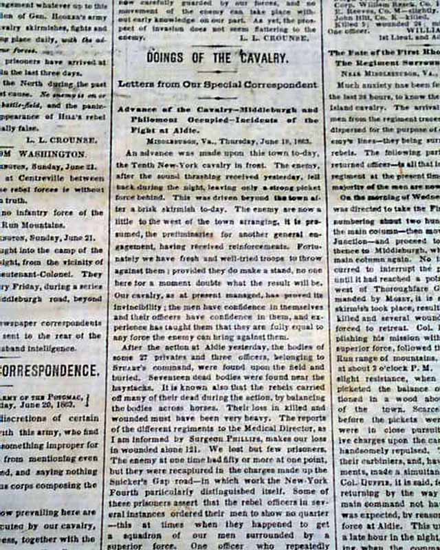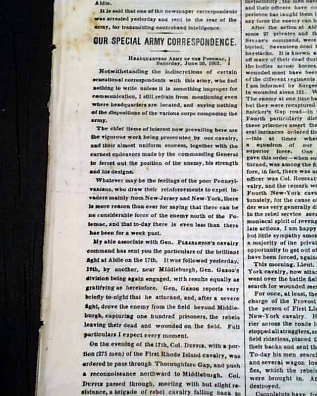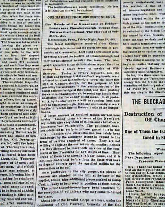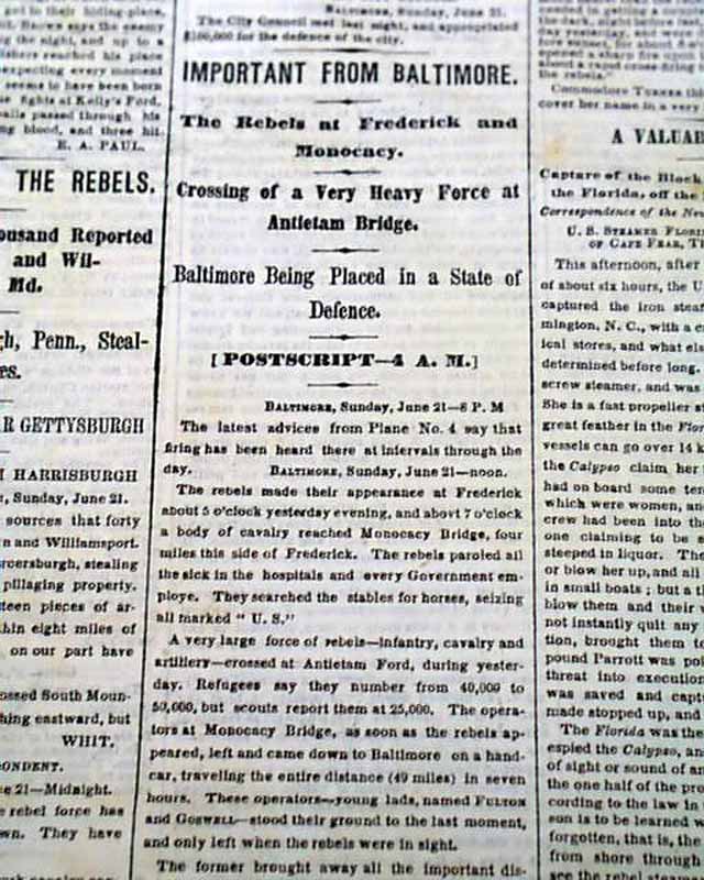 Among the front page column heads on the Civil War are several relating to the Confederate advance towards Gettysburg: "Movements Of The Rebels" "A Force of 40,000 Reported at Hagerstown & Williamsport, Md." "Cavalry at Mercersburgh, Penn., Stealing Horses" "A Force Said To be Near Gettysburgh" "The Rebels Still at Greencastle on Friday--Scouts Near Chambersburgh..." and more.