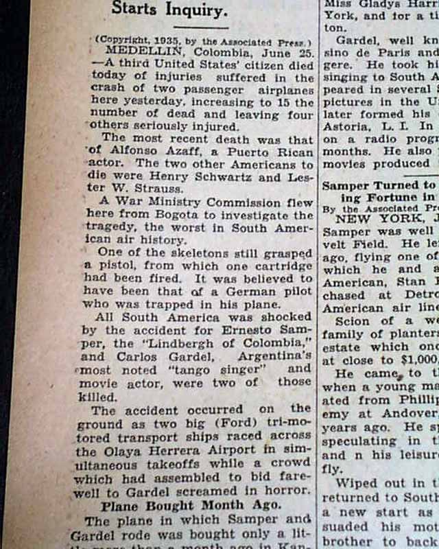 AI notes: The 1935 Carlos Gardel airplane crash occurred on June 24, 1935, at Olaya Herrera Airport in Medellín, Colombia, and claimed the life of Carlos Gardel, the world-famous Argentine tango singer, along with most of his entourage. Gardel was traveling aboard a SACO Ford Trimotor aircraft that, during takeoff, veered off course and collided with a SCADTA Trimotor parked on the runway. Both planes burst into flames, killing 17 people, including Gardel, lyricist Alfredo Le Pera, and several musicians and crew members; a few passengers survived with severe injuries. The exact cause has never been definitively proven, though factors such as pilot error, strong crosswinds, mechanical limitations, and runway congestion have all been cited. Gardel’s death at age 44 stunned Latin America, triggering massive public mourning and cementing his legend—immortalized by the famous saying, “Gardel sings better every day.”