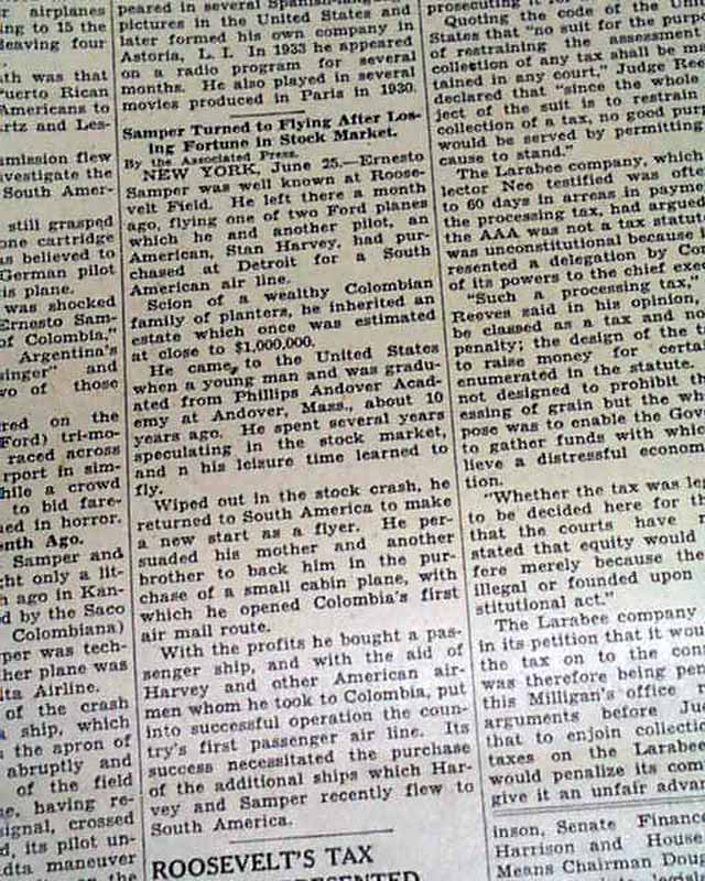 The top of page 2 has a one column heading: "15 KILLED WHEN COLUMBIA PLANES CRASH ON GROUND" with subheads and photo. (see images)