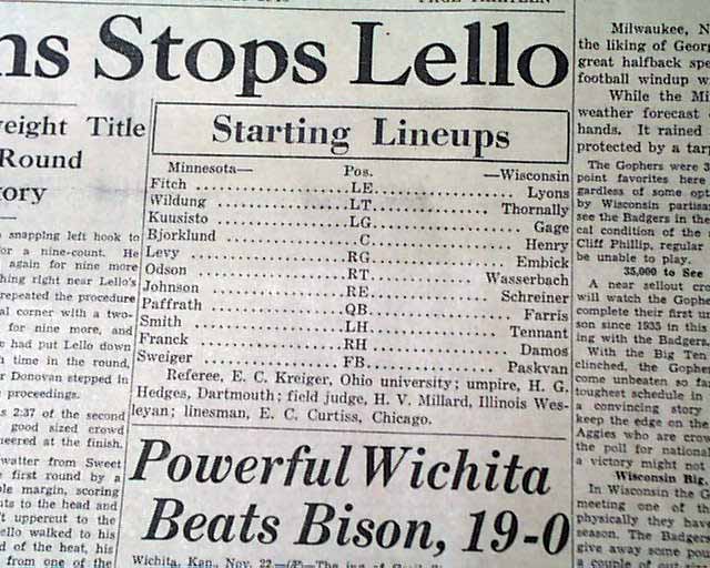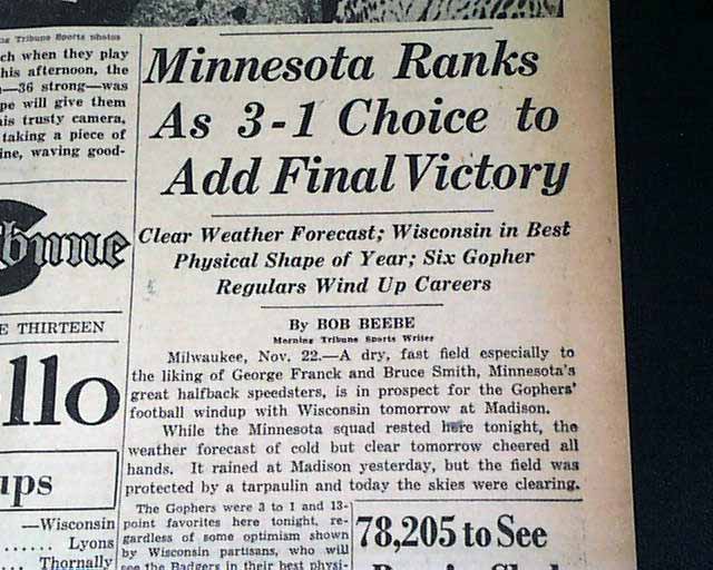 The Minnesota Golden Gophers faced the Wisconsin Badgers on November 23, 1940, in a Big Ten conference matchup. Minnesota won decisively, 13–0, shutting out Wisconsin behind a strong defensive performance and a steady running attack. This victory capped their undefeated season and helped secure the Big Ten title, while also demonstrating the Gophers’ dominance in conference play that year. It was part of their final stretch of wins that contributed to the national championship recognition for the 1940 team.