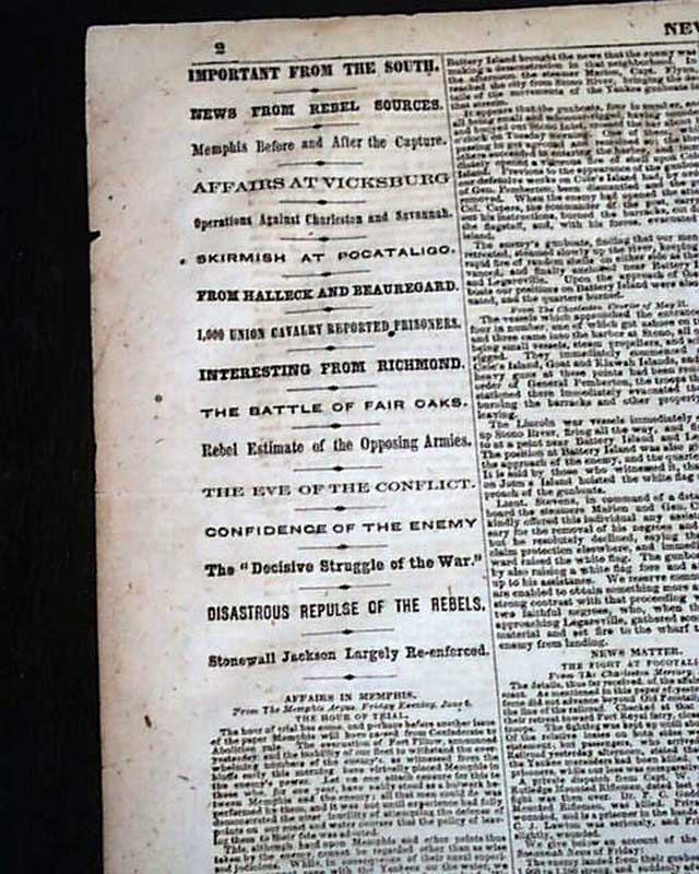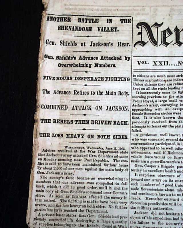 There are also first column heads on the Civil War including: "Another Battle In The Shenandoah Valley" "Gen. Shields at Jackson's Rear" "Gen. Shields's Advance Attacked by Overwhelming Numbers" "Five Hours' Desperate Fighting" "Combined Attack On Jackson" "The Rebels Then Driven Back" and more.