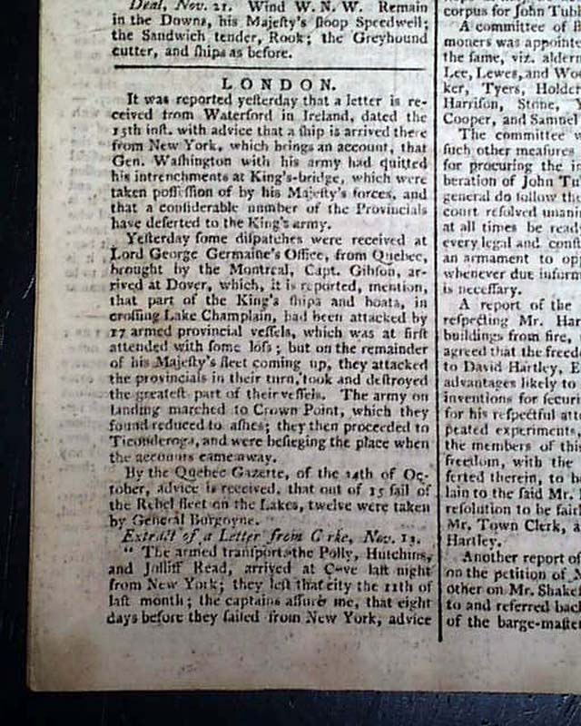 An inside pg. has a report which begins: "...from New York which brings an account that Gen. Washington with his army had quitted his intrenchments at King's Bridge which were taken possession of by his Majesty's forces, & that a considerable number of the Provincials have deserted to the King's army..." plus other reports.