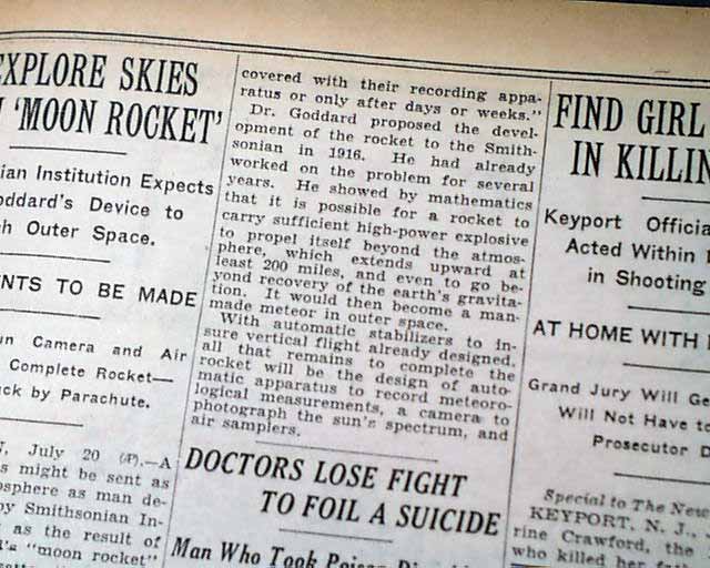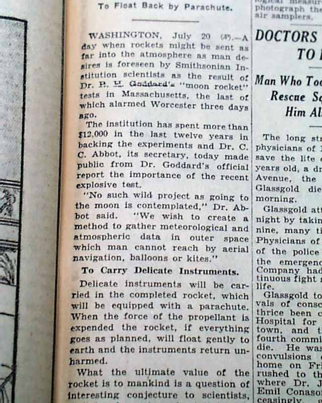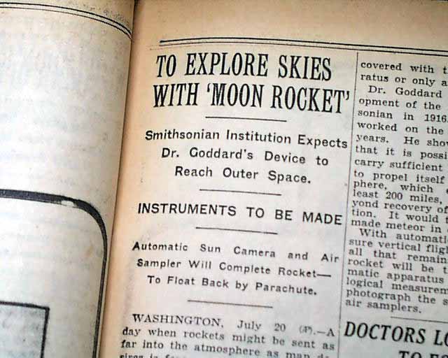 The top of page 11 has column heads that include: "TO EXPLORE SKIES WITH 'MOON ROCKET'" "Smithsonian Institution Expects Dr. Goddard's Device to Reach Outer Space" "INSTRUMENTS TO BE MADE" and more (see images ). Very early reporting on the world of rocketry.