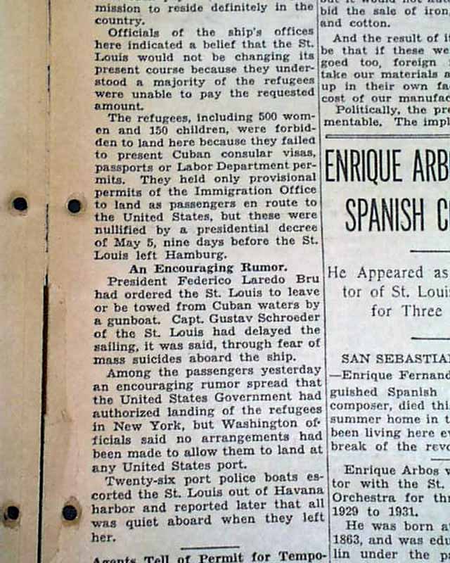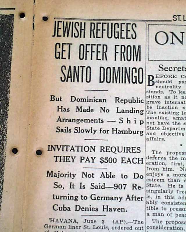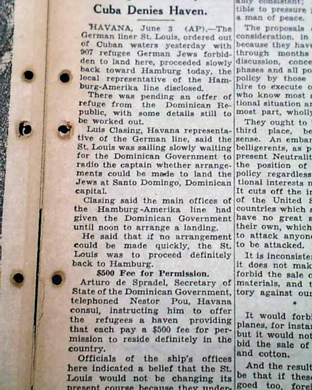 The top of page 5 on the first column is a one column heading: "JEWISH REFUGEES GET OFFER FROM SANTO DOMINGO" with subheads. (see images) Nice to have from the city of the ocean liner's namesake. Very rare as such.