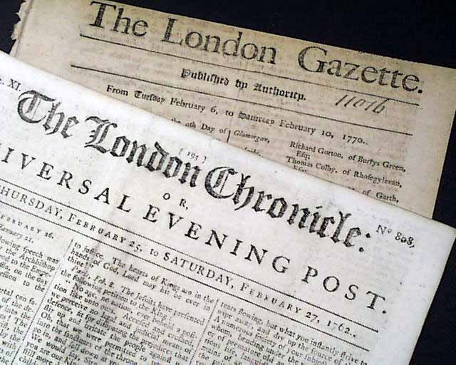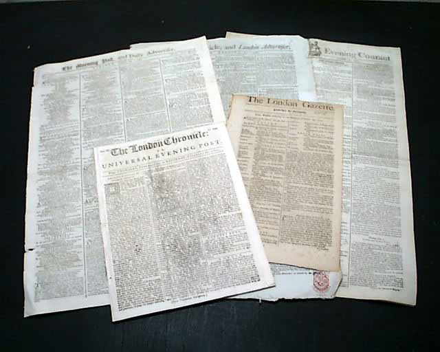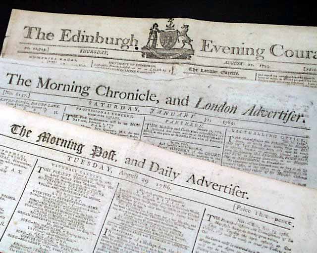 Titles and dates in this lot include: The London Chronicle, Feb. 27, 1762; The London Gazette, Feb. 10, 1770; The Morning Post, Aug. 29, 1786; The Morning Chronicle, Jan. 31, 1789 and The Edinburgh Evening Courant, Aug. 22, 1793.
