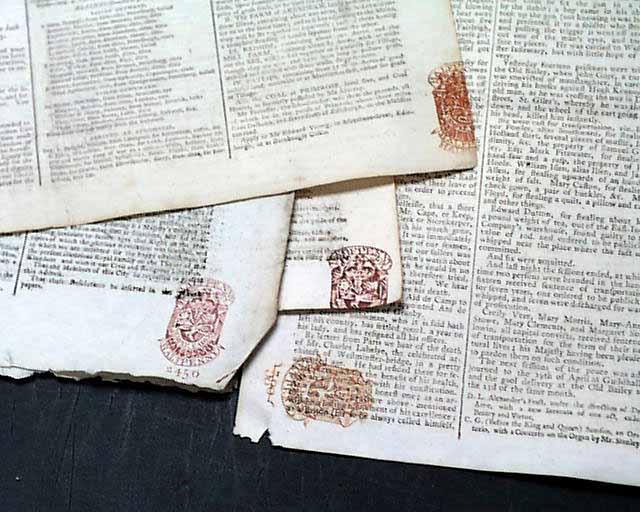 (5) An interesting & unique lot of five British newspapers, containing all different titles from the 18th century. They span the 1760's thru the 1790's and include at least one from each decade. Some have red ink stamps (partial or otherwise, see images). Certainly a one-of-a-kind grouping.