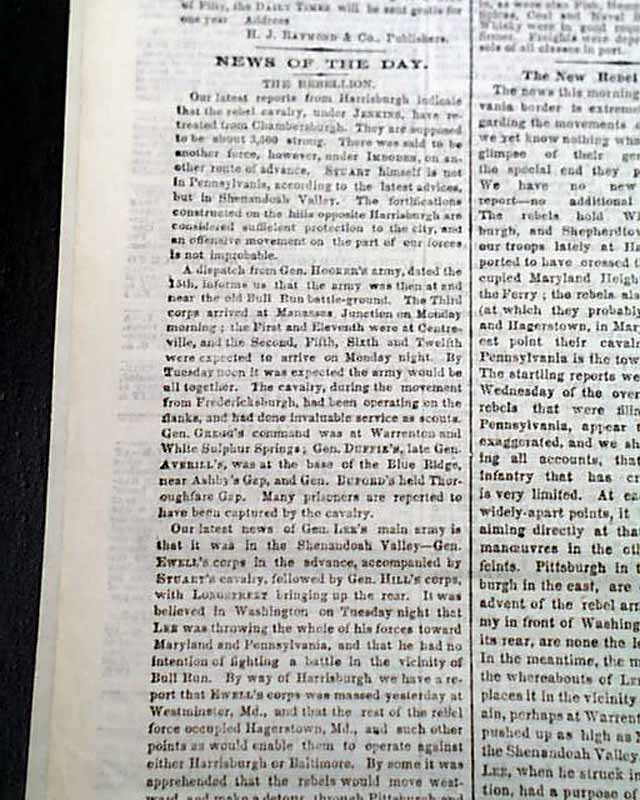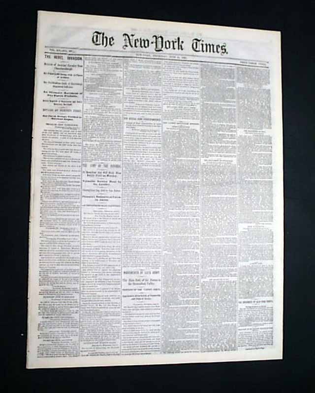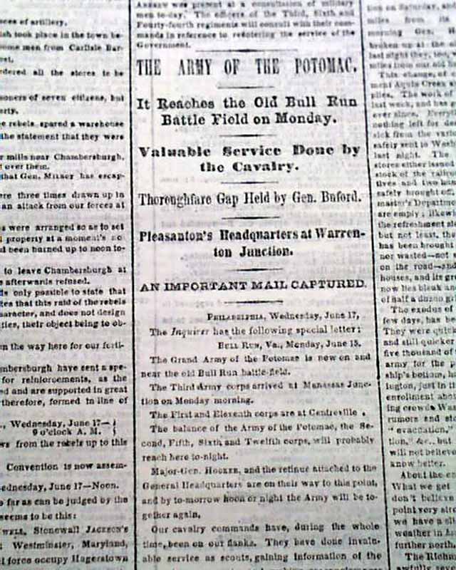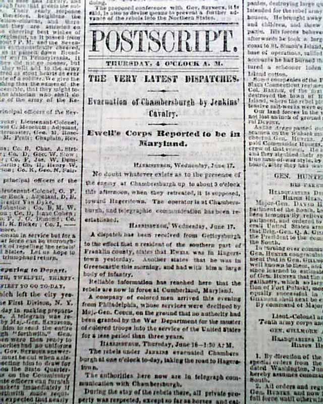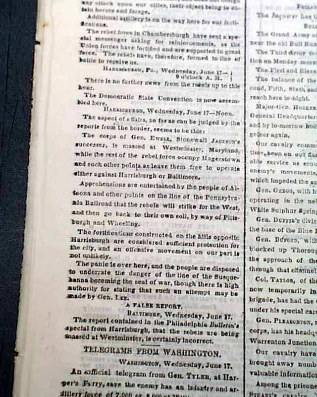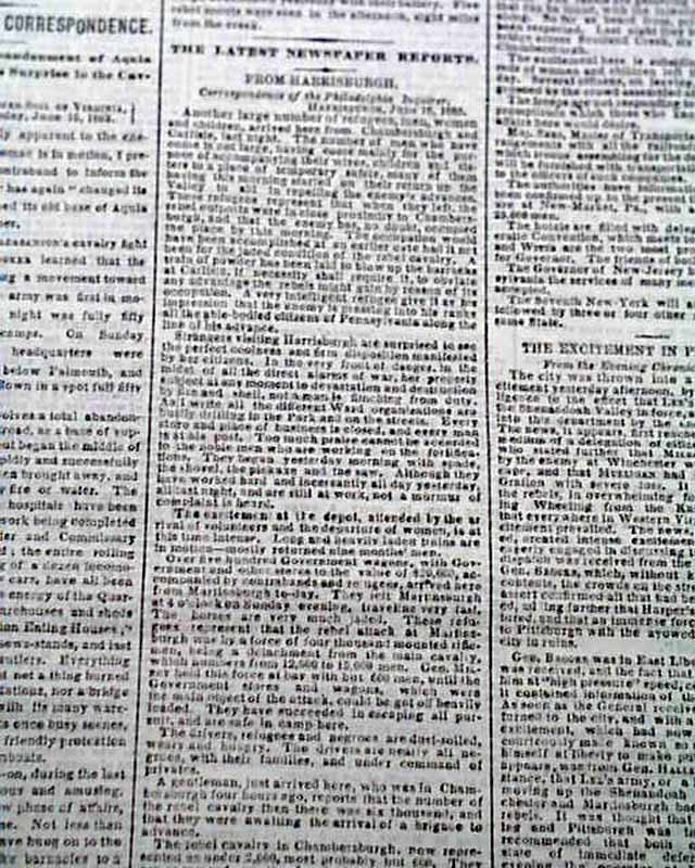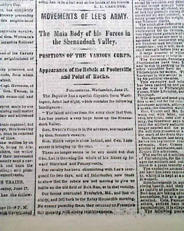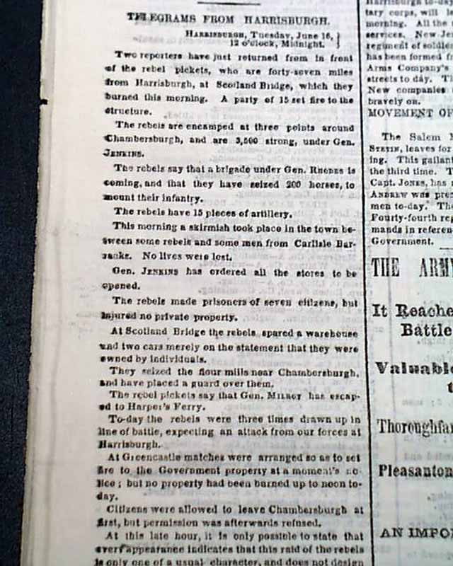 Among the front page column heads on the Civil War are: "THE REBEL INVASION" "Retreat of Jenkins' Cavalry from Chambersburgh" "Our Fortifications South of Harrisburgh Considered Sufficient" "Movements of Lee's Army" "The Main Body of His Forces in the Shenandoah Valley" & much more.