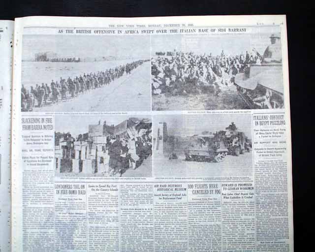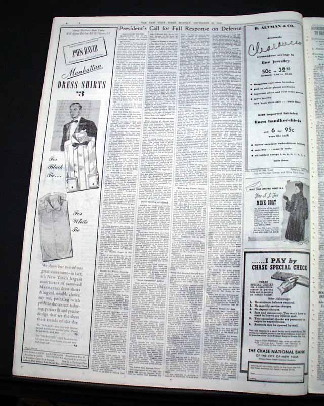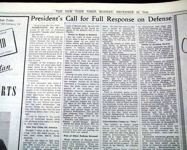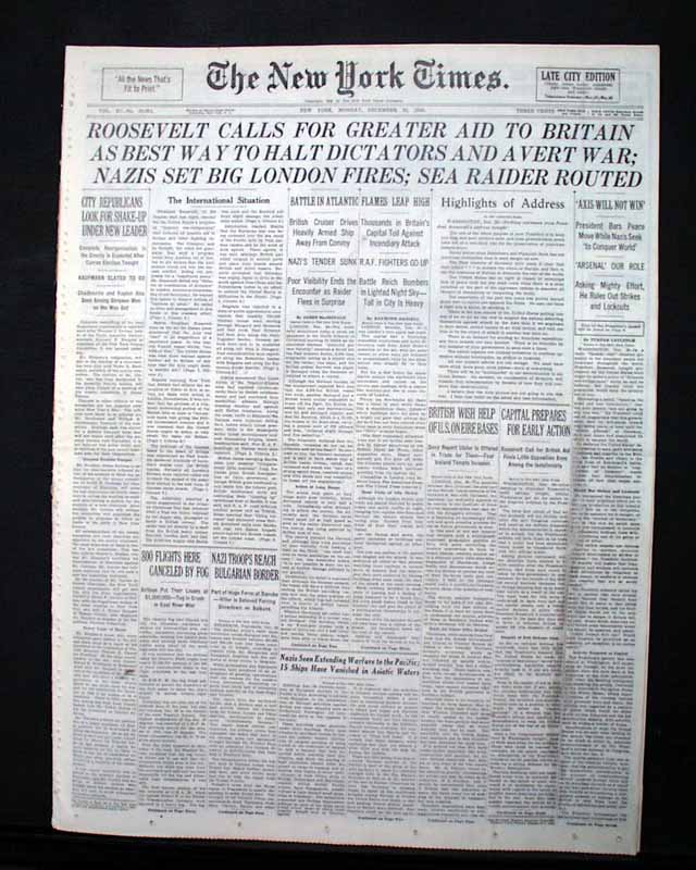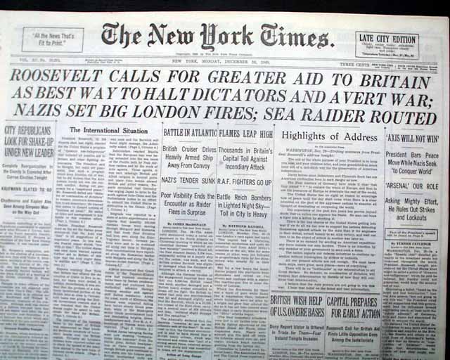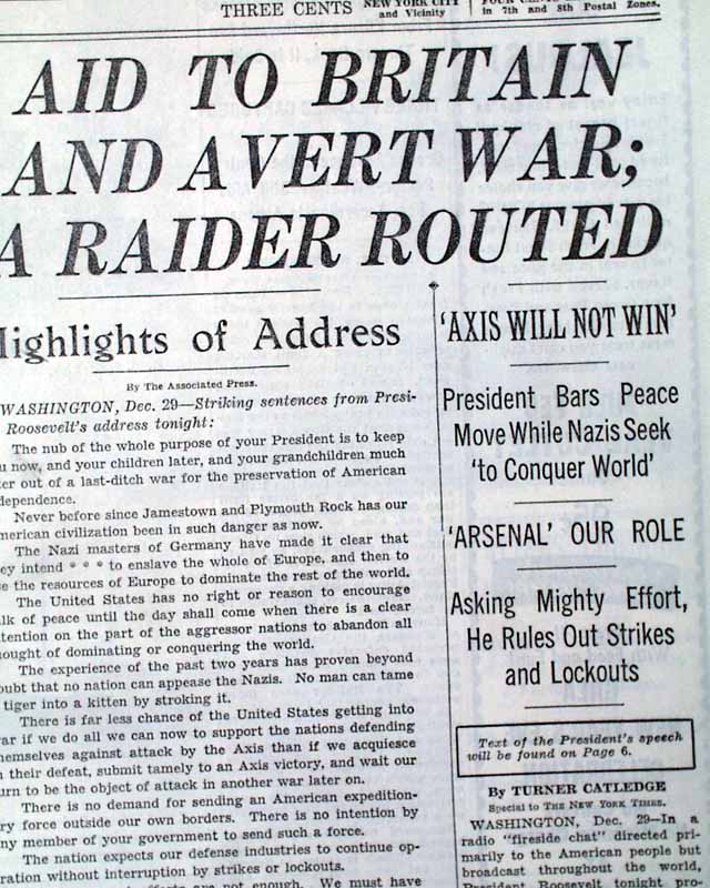 The front page has a great banner headline: "ROOSEVELT CALLS FOR GREATER AID TO BRITAIN; 'AXIS WILL NOT WIN'" with subheads. Nice for display. Complete text of his speech appears on page 6. Much content on this "Fireside Chat" and includes an image of FDR in front of his microphone during his address to the American people.