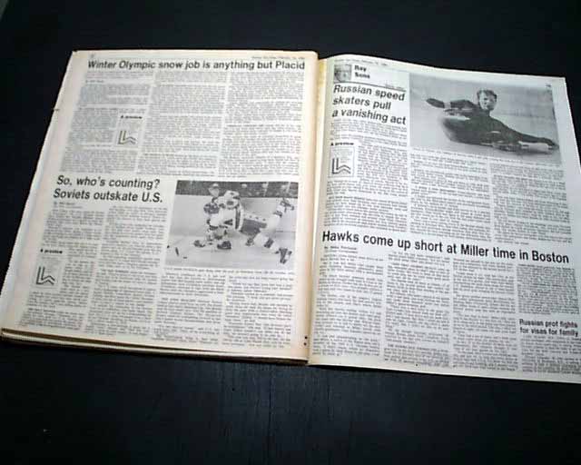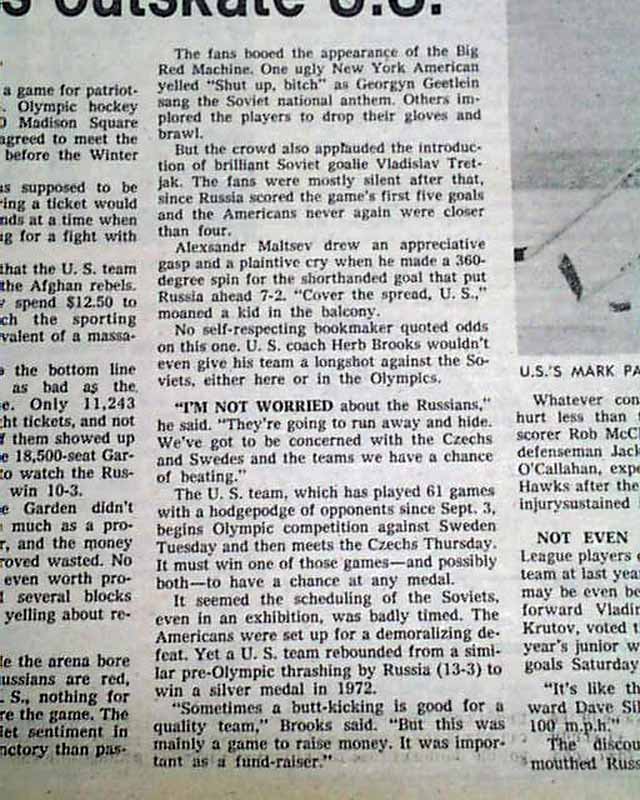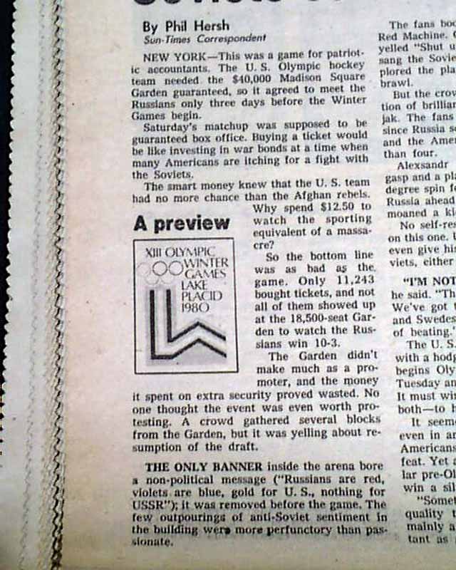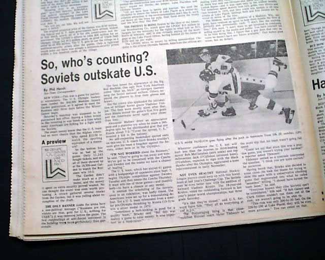 Near the back on page 132 is a heading that reads: "So, who's counting? Soviets outskate U.S." with related photo and box scores.(see images) This drubbing by the Soviets set up the stage for the historic "Miracle on Ice" win by the United States hockey team shortly after.