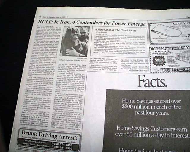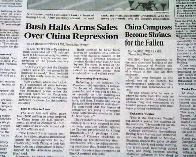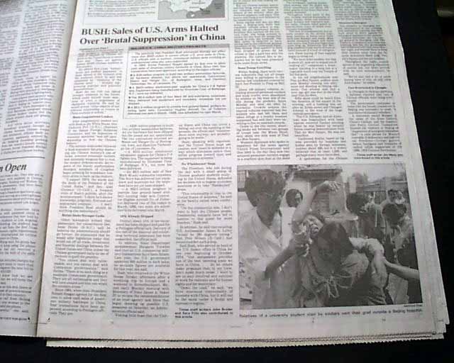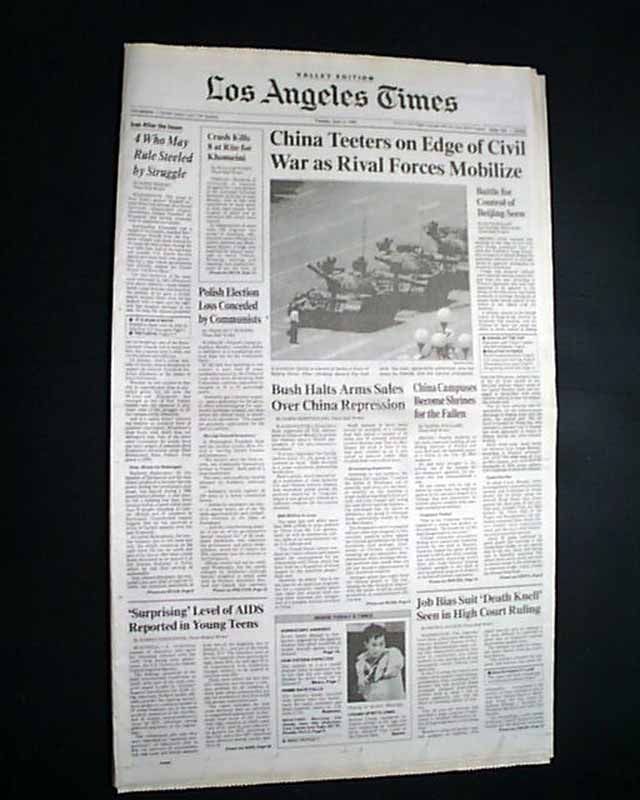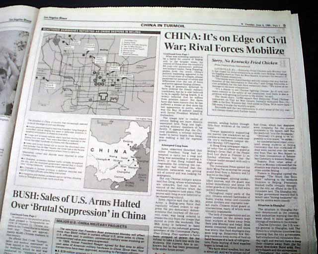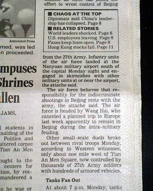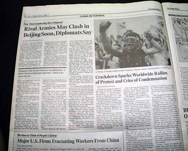 The top of the front page has a headline that reads: "China Teeters on Edge of Civil War as Rival Forces Mobilize" with subhead. Also on the front page is the iconic photo of "Tank Man" during the Tiananmen Square protests and massacre. (see images) Much more inside. Loads of text.