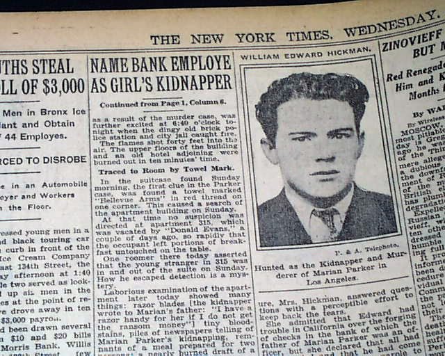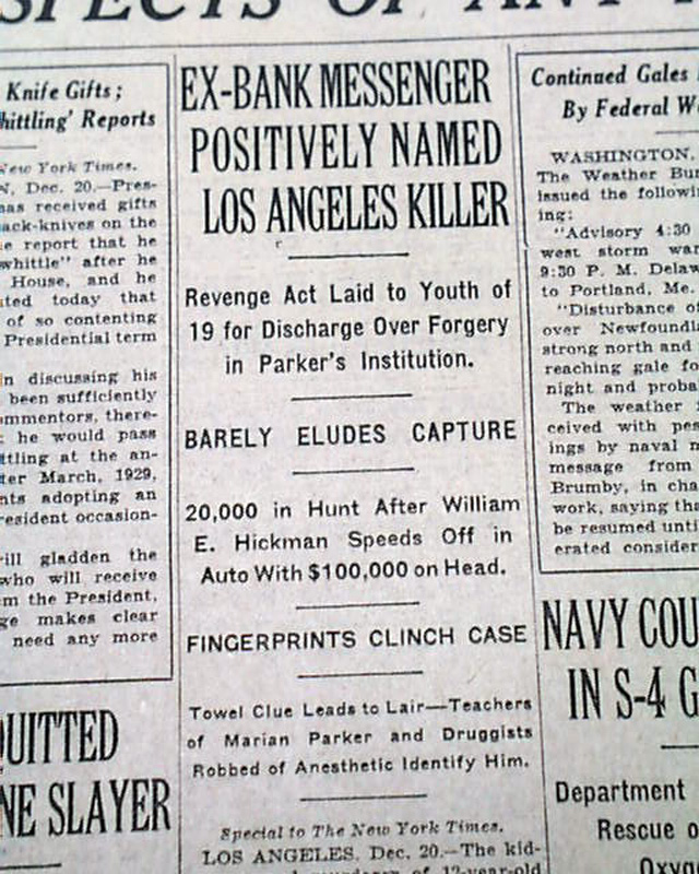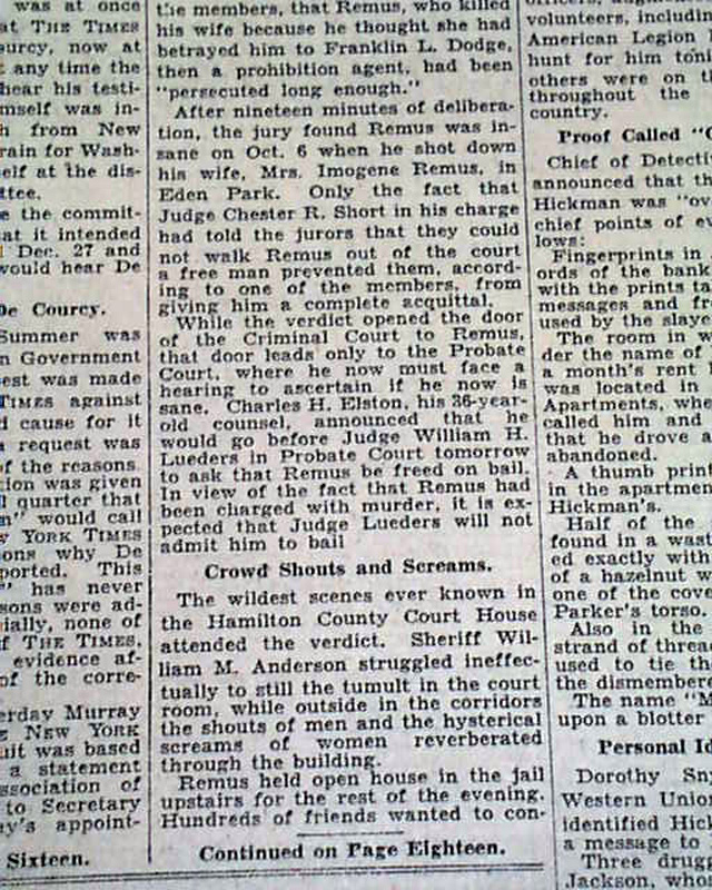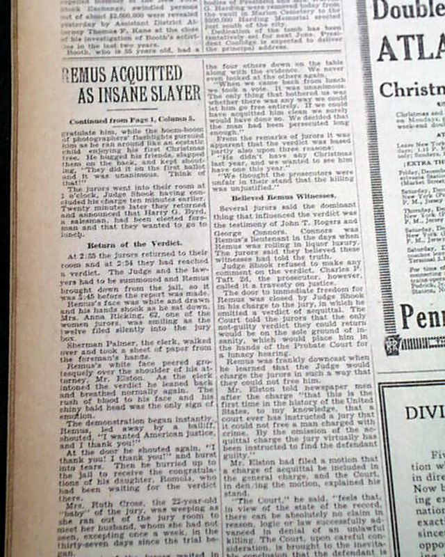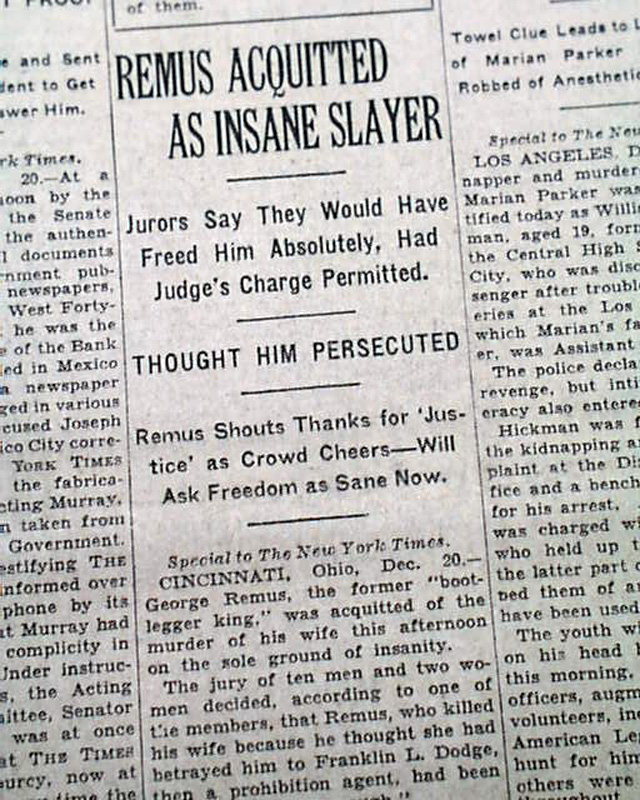 The front page has a one column heading: "REMUS ACQUITTED AS INSANE SLAYER" with subheads. (see images)