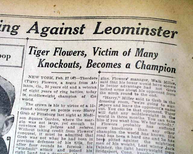 The sport's section (page 8) has a two column heading: "Tiger Flowers, Victim of Many Knockouts, Becomes a Champion". (see images)