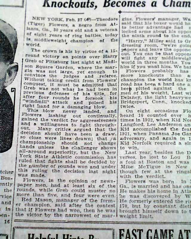 background: Tiger Flowers won the world middleweight boxing championship on February 26, 1926, when he defeated the legendary Harry Greb by a hard-fought 15-round decision at Madison Square Garden in New York City. Flowers, a tough and intelligent fighter from Georgia, used disciplined defense and steady counterpunching to blunt Greb’s relentless, swarming style, earning the nod from the judges after a grueling bout. With the victory, Flowers became the first African American to hold the world middleweight title, a landmark achievement in boxing history during an era of deep racial barriers. He later defended the title successfully before losing it to Mickey Walker in 1927.