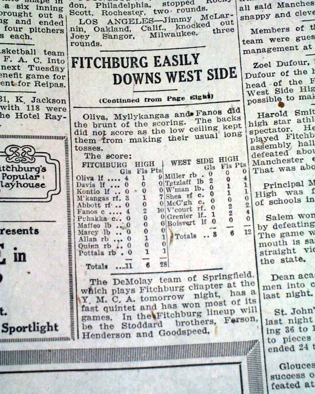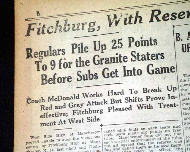 And the top of page 8 has a banner heading: "Fitchburg, With Reserves Playing Part Of Game, Trims Manchester" with subheads and box scores.