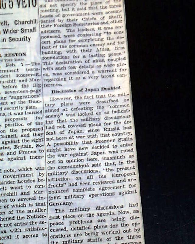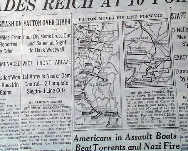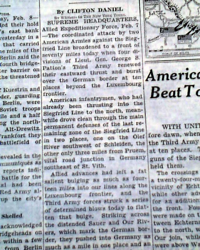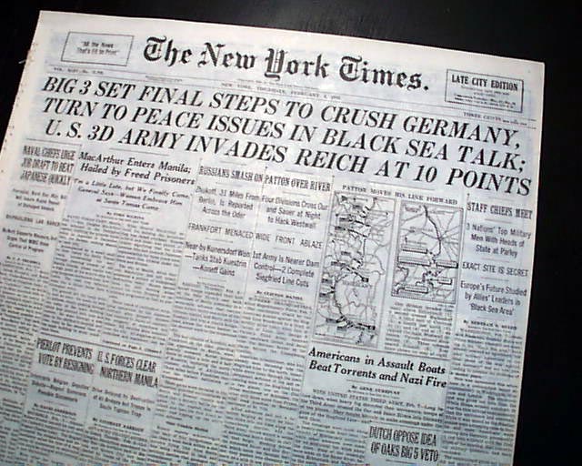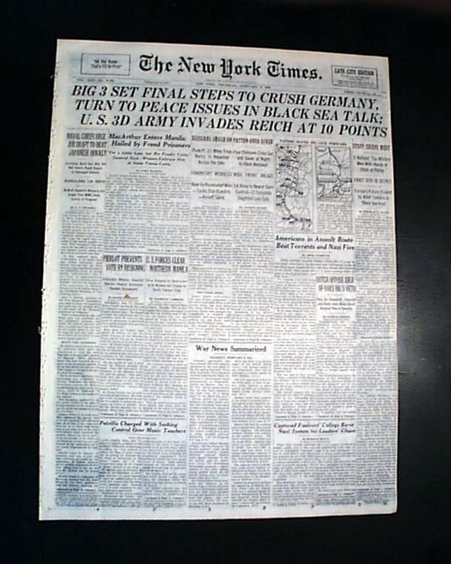 The front page has a banner headline: "BIG 3 SET FINAL STEPS TO CRUSH GERMANY, TURN TO PEACE ISSUES IN BLACK TALK; U. S. 3D ARMY INVADES REICH AT 10 POINTS" with subheads.(see images)