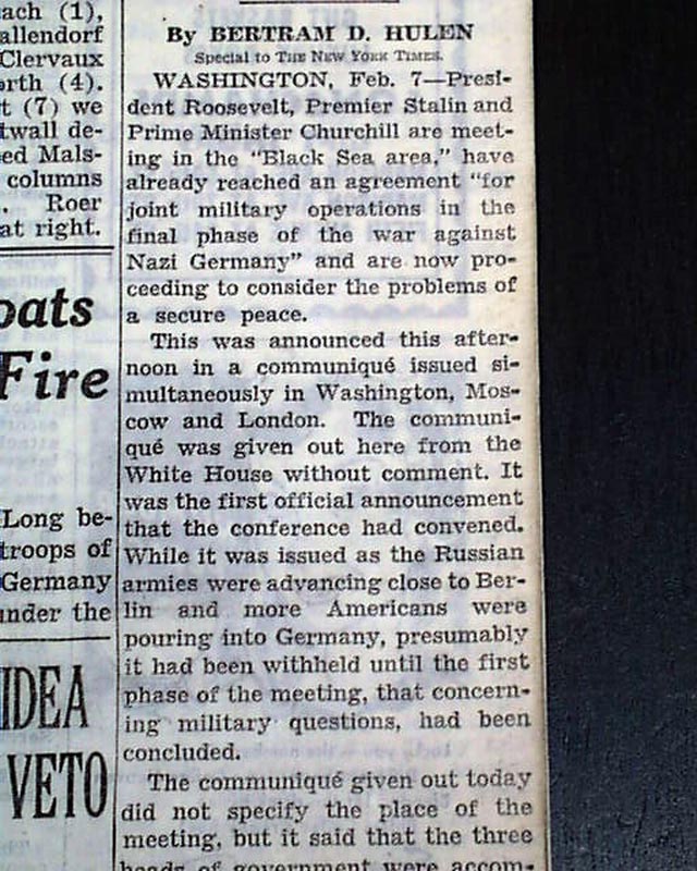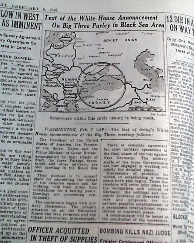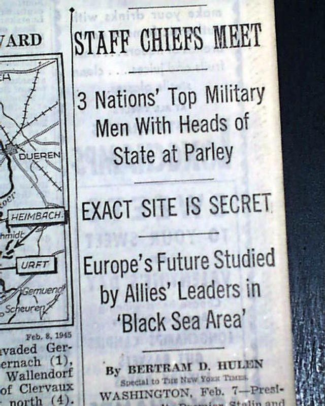 AI notes: On February 7, 1945, during the Yalta Conference on the Black Sea in Crimea, U.S. President Franklin D. Roosevelt, British Prime Minister Winston Churchill, and Soviet Premier Joseph Stalin met with their senior advisors to coordinate the final stages of World War II and to plan the postwar order. The leaders discussed strategies for the unconditional defeat of Nazi Germany, including the division of Germany into occupation zones, the demilitarization and reparations of the defeated state, and the establishment of mechanisms to prevent future aggression. They also addressed the future of Eastern Europe, particularly Poland, agreeing in principle to hold free elections—though the interpretation of this would later spark tensions. In addition, the conference set the stage for the Soviet Union’s entry into the war against Japan after Germany’s surrender, in exchange for territorial concessions, and laid the groundwork for the United Nations, including arrangements for Security Council voting. The discussions around February 7 reflected both cooperation and emerging tensions among the “Big Three,” shaping the geopolitical landscape and ultimately influencing the onset of the Cold War.