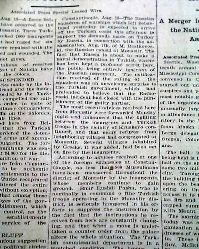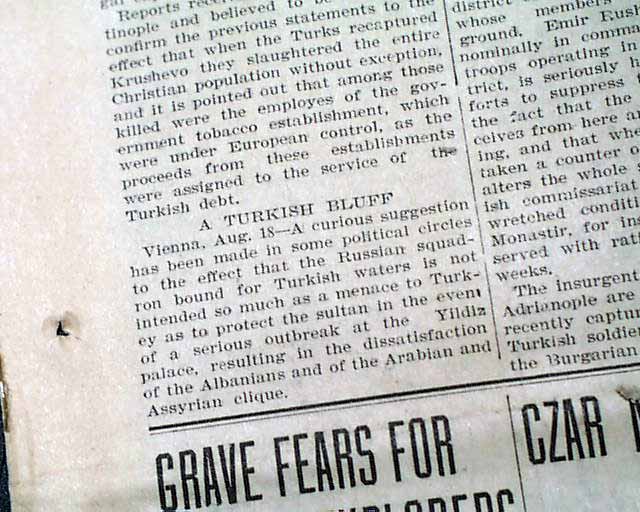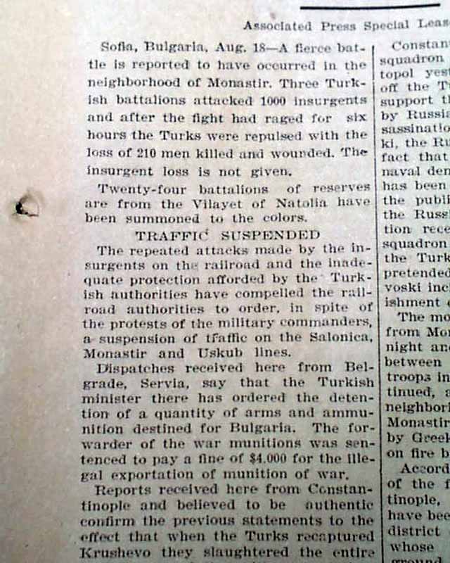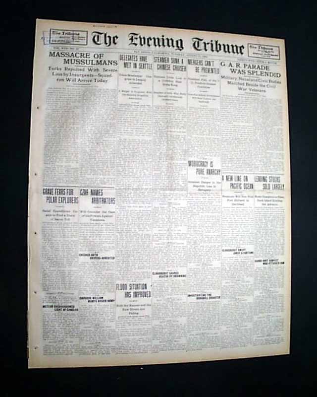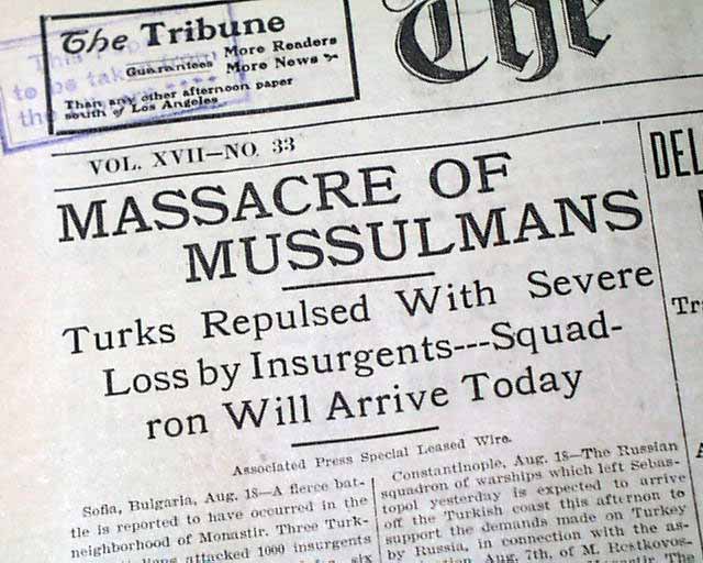 The top of the front page has a two column headline: "MASSACRE OF MUSSULMANS" with subhead. (see images) Surprisingly this issue is in good condition being from the "wood pulp" era. Very hard to find issues that are not totally fragile from this era in paper.
