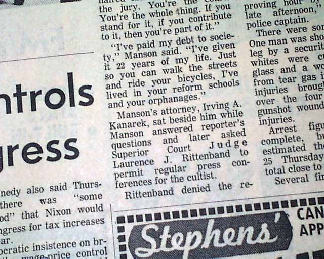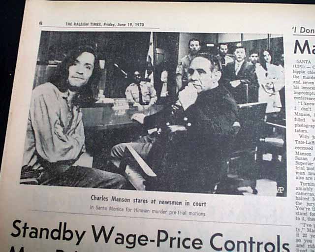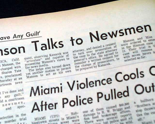 The top of page 6 has a four column heading: "Manson Talks to Newsmen" with lead-in: "'I Don't Have Any Guilt'" and rare photo showing Manson with his lawyer in the courtroom. (see images)