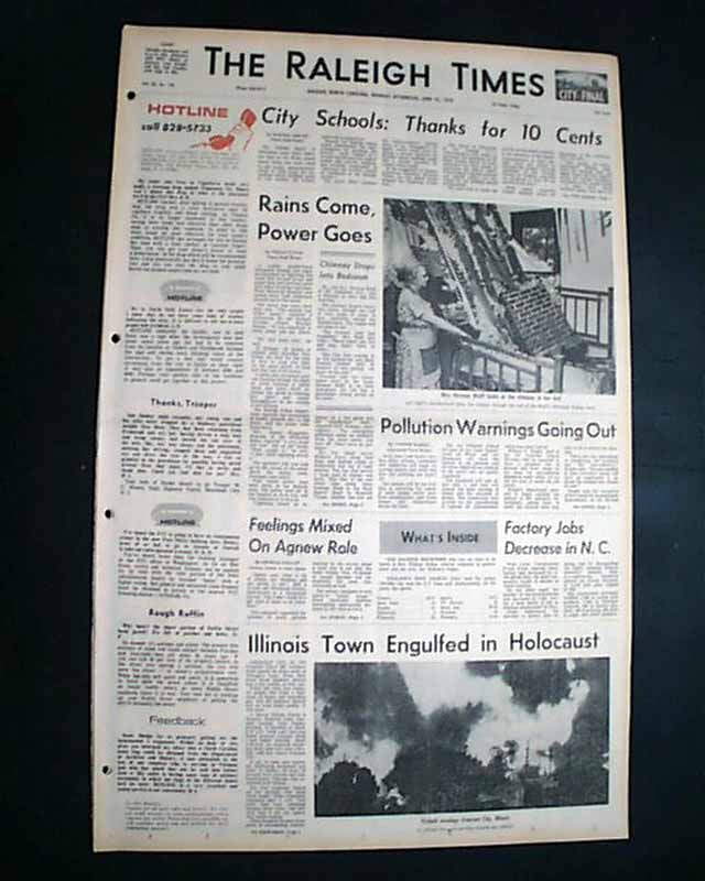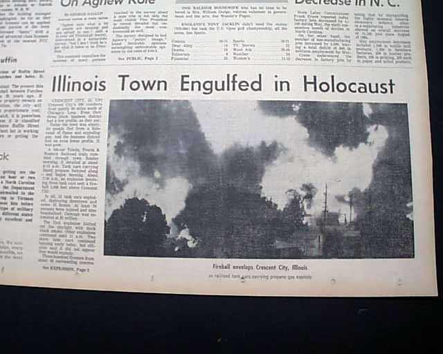 Near the bottom of the front page is a six column heading: "Illinois Town Engulfed in Holocaust" with photo. (see images)