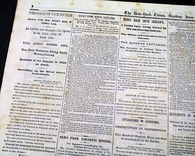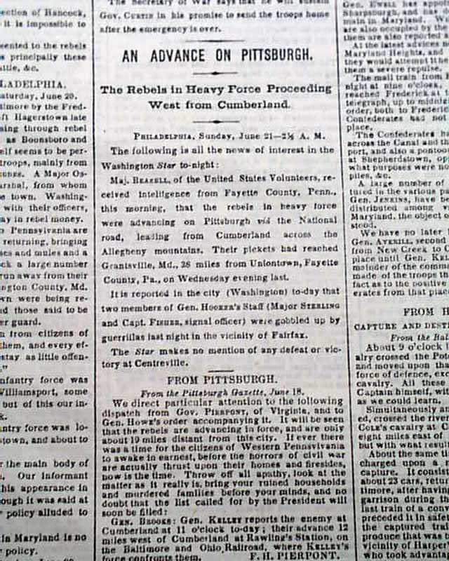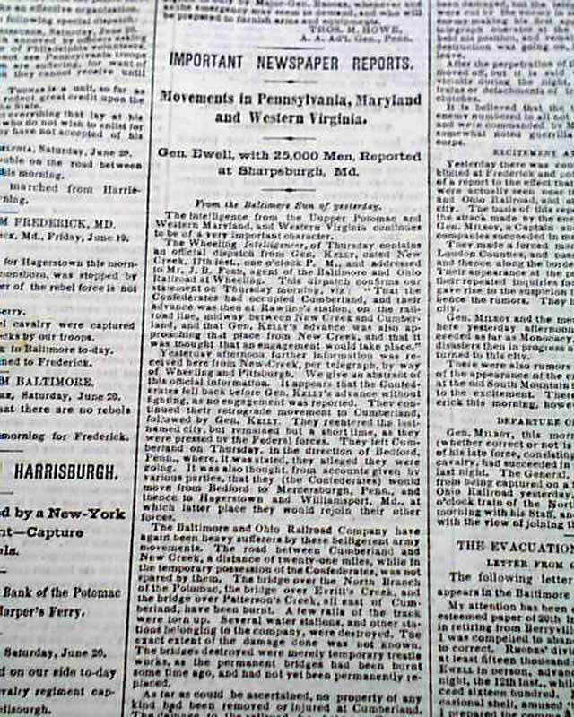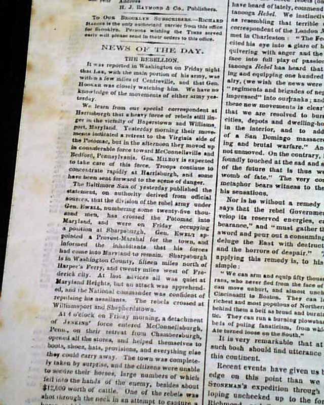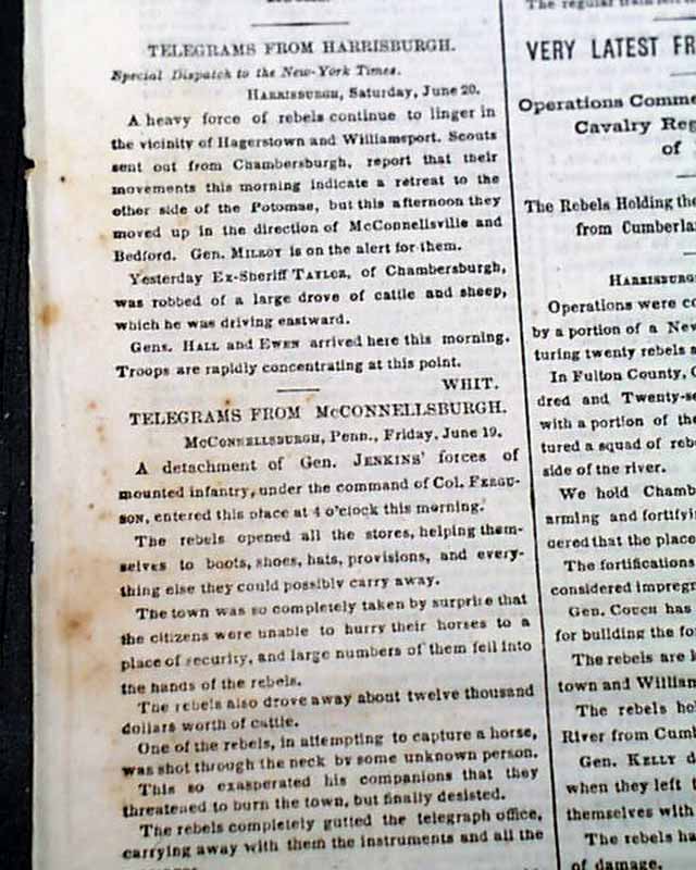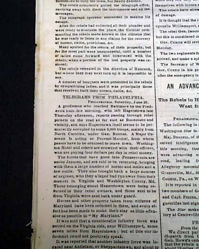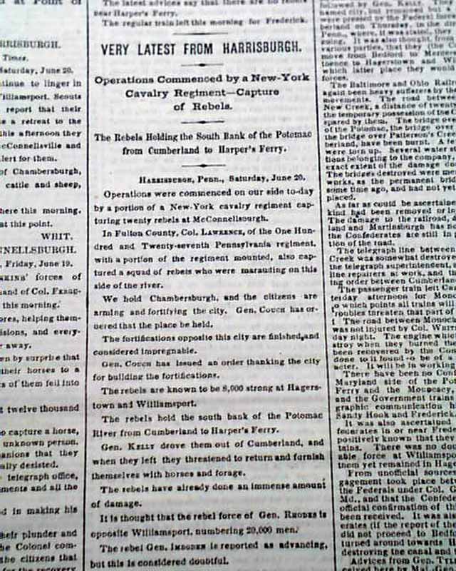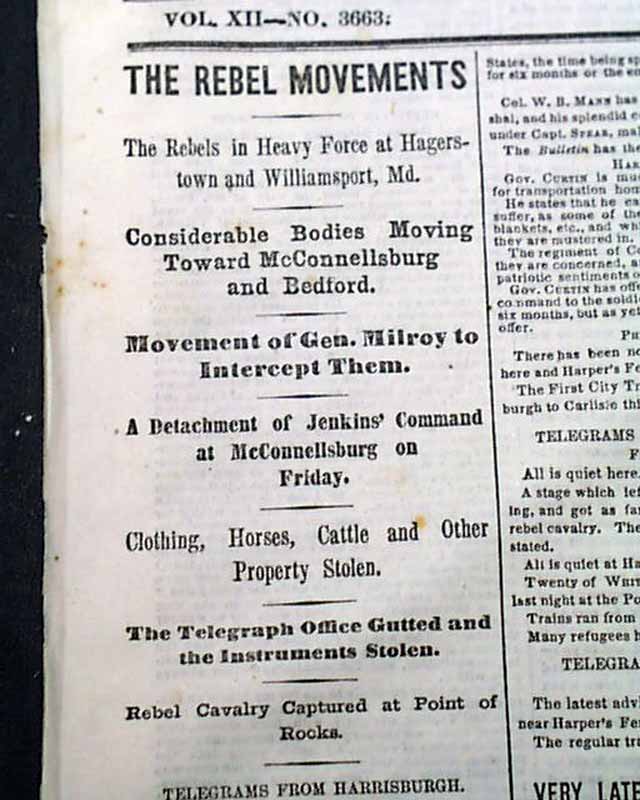 Among the front page column heads on the Civil War are: "THE REBEL MOVEMENTS" "Rebels in Heavy Force at Hagerstown and Williamsport, Md." "Considerable Bodies Moving Toward McConnellsburg & Bedford" "Movement of Gen. Milroy to Intercept Them" "A Detachment of Jenkins' Command at McConnellsburg..." Very Latest From Harrisburgh" "Movements in Pennsylvania, Maryland and Western Virginia" "An Advance On Pittsburgh" and more.