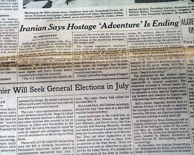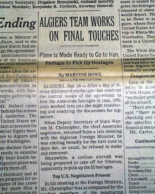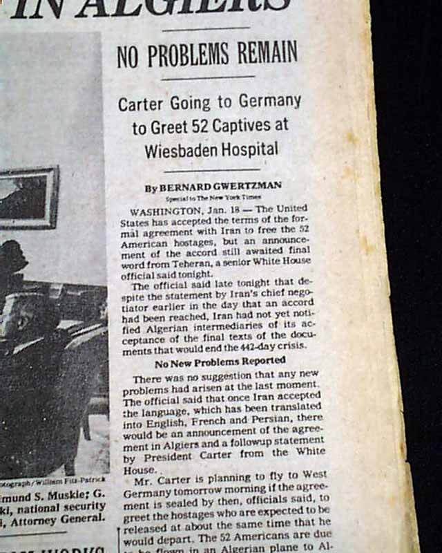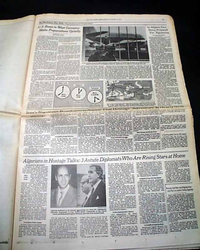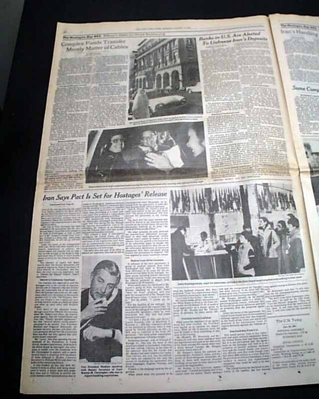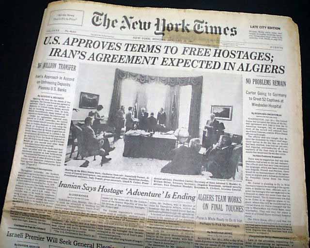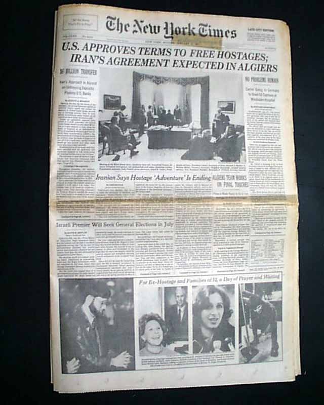 The front page has a nice banner announcing: "U.S APPROVES TERMS TO FREE HOSTAGES; IRAN'S AGREEMENT EXPECTED IN ALGIERS" with subheads and a few related photos. (see images) Much more inside.
