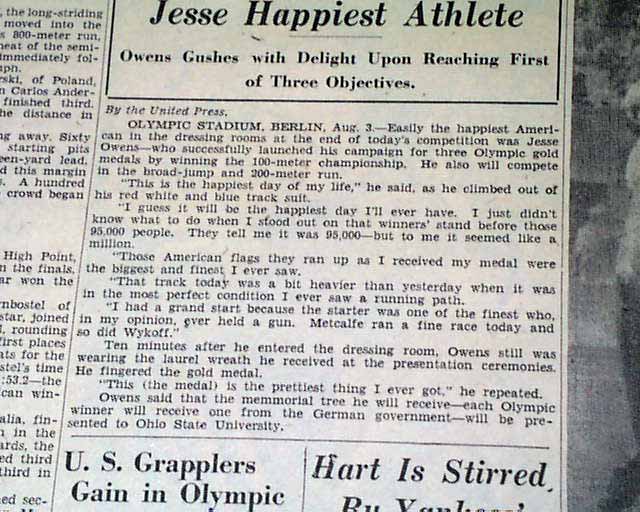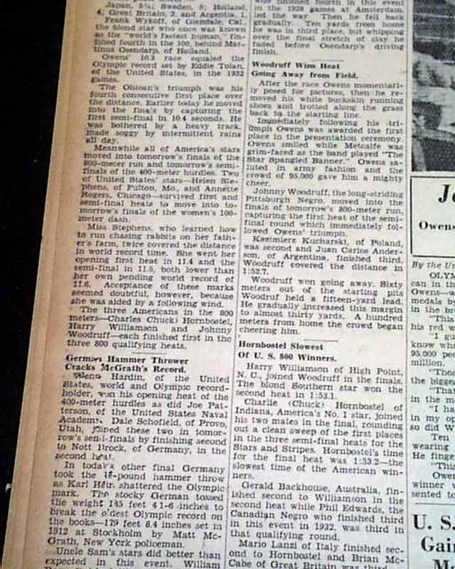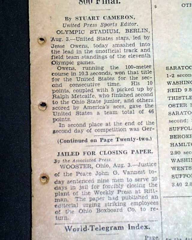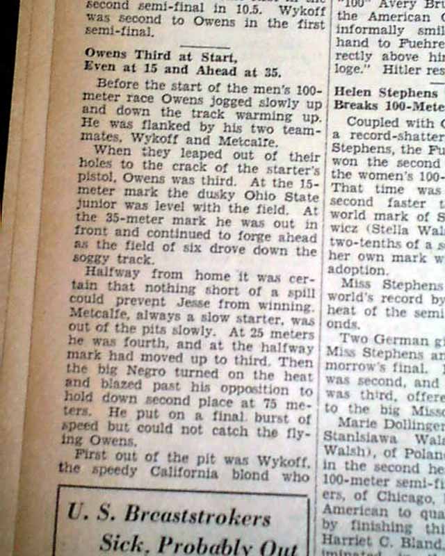 The front page has a three column heading: "OWENS HITS 10.3 MARK AGAIN IN 100 FINAL, METCALFE 2ND" with subheads. First (same day) report continues in the sport's section (page 22) with photo showing Owens with heading: "Cocoa Comet Streaks to World Mark in Olympics" (see images)