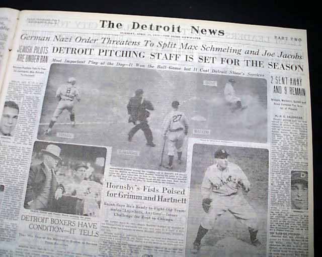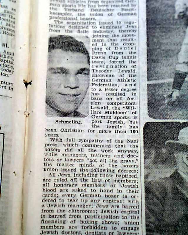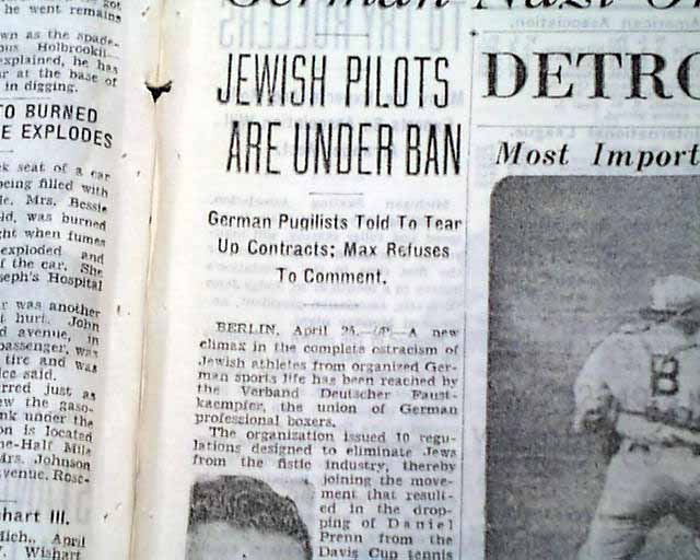 The front page of the sport's section has a banner heading: "German Nazi Order Threatens To Split Max Schmeling and Joe Jacobs" with subheads and small photos of each involved. (see images)
