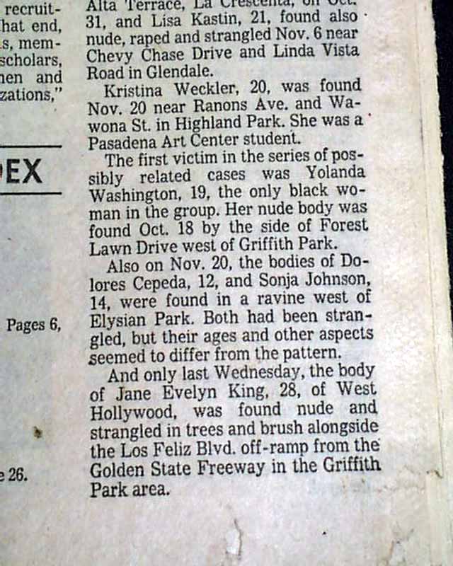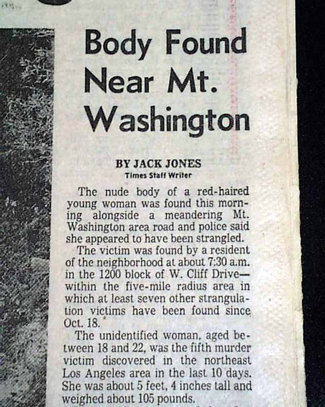 background: On November 29, 1977, police found the body of 18-year-old Lauren Rae Wagner, a business student who lived with her parents in the San Fernando Valley, in the hills around Mount Washington. She had ligature marks on her neck, ankles, and wrists, as well as burn marks on her hands indicating she was tortured. Lauren's parents had expected her to come home before midnight, and the next morning, when they found her car parked across the street with the door ajar, her father questioned the neighbors.He found that the woman who lived in the house where Lauren's car had been parked saw her abduction. This woman stated that she saw two men: one was tall and young, the other one was older and shorter with bushy hair. She also stated that she heard Wagner cry out "You won't get away with this!" during her abduction.